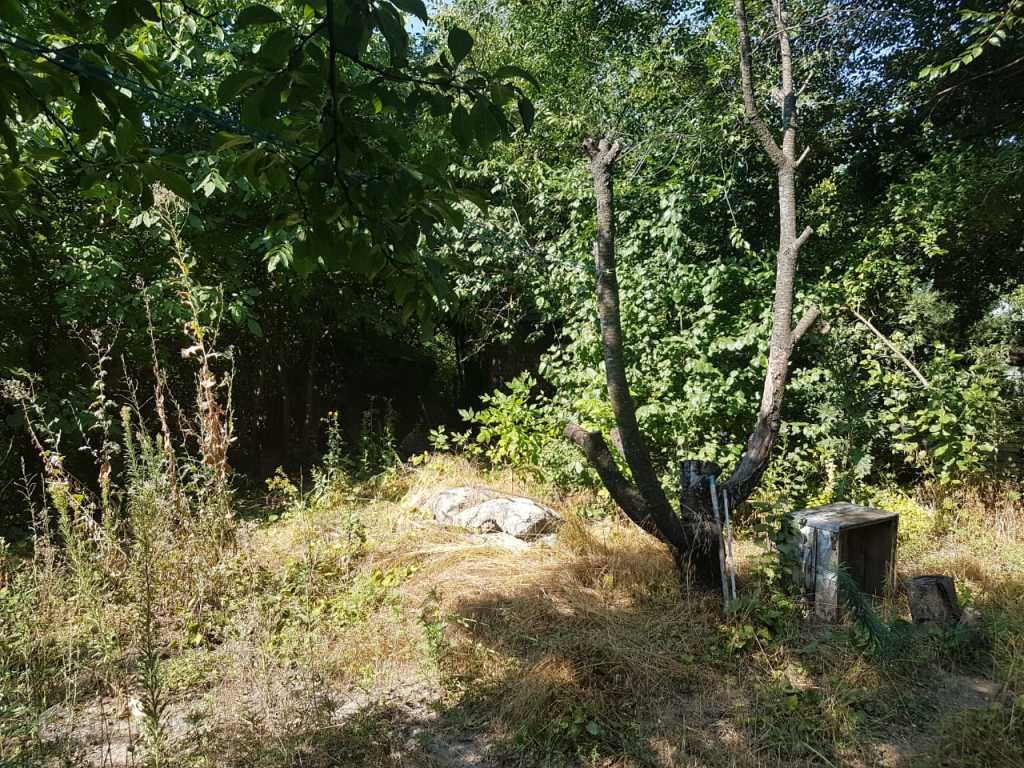 На участке электричество, скважина, жилой вагончик, фундамент и металлический каркас под дом, много плодовых деревьев. Огорожен. Вокруг живут люди.