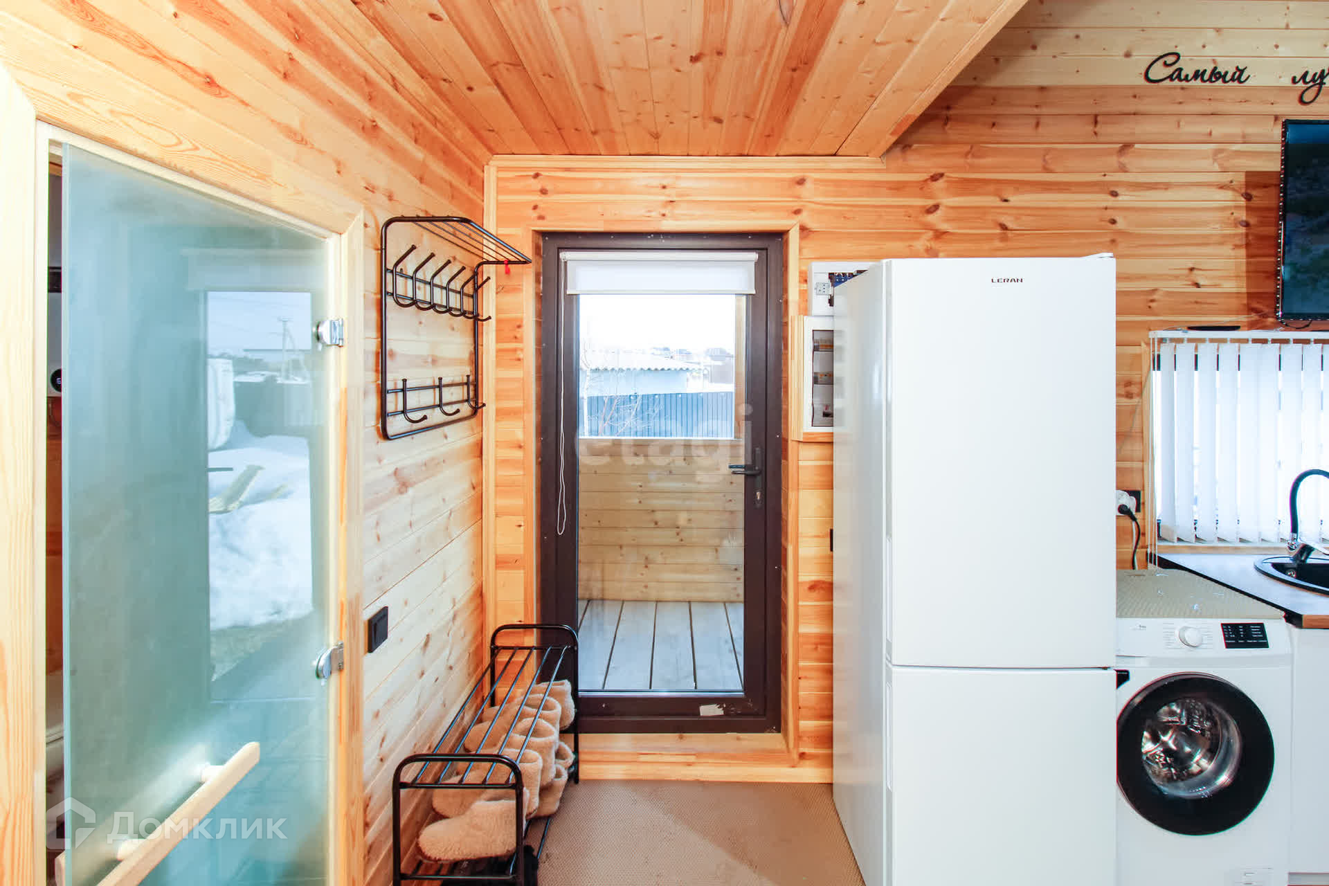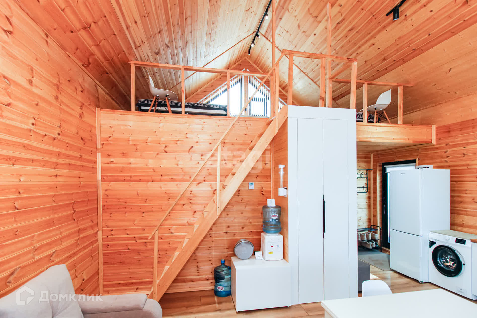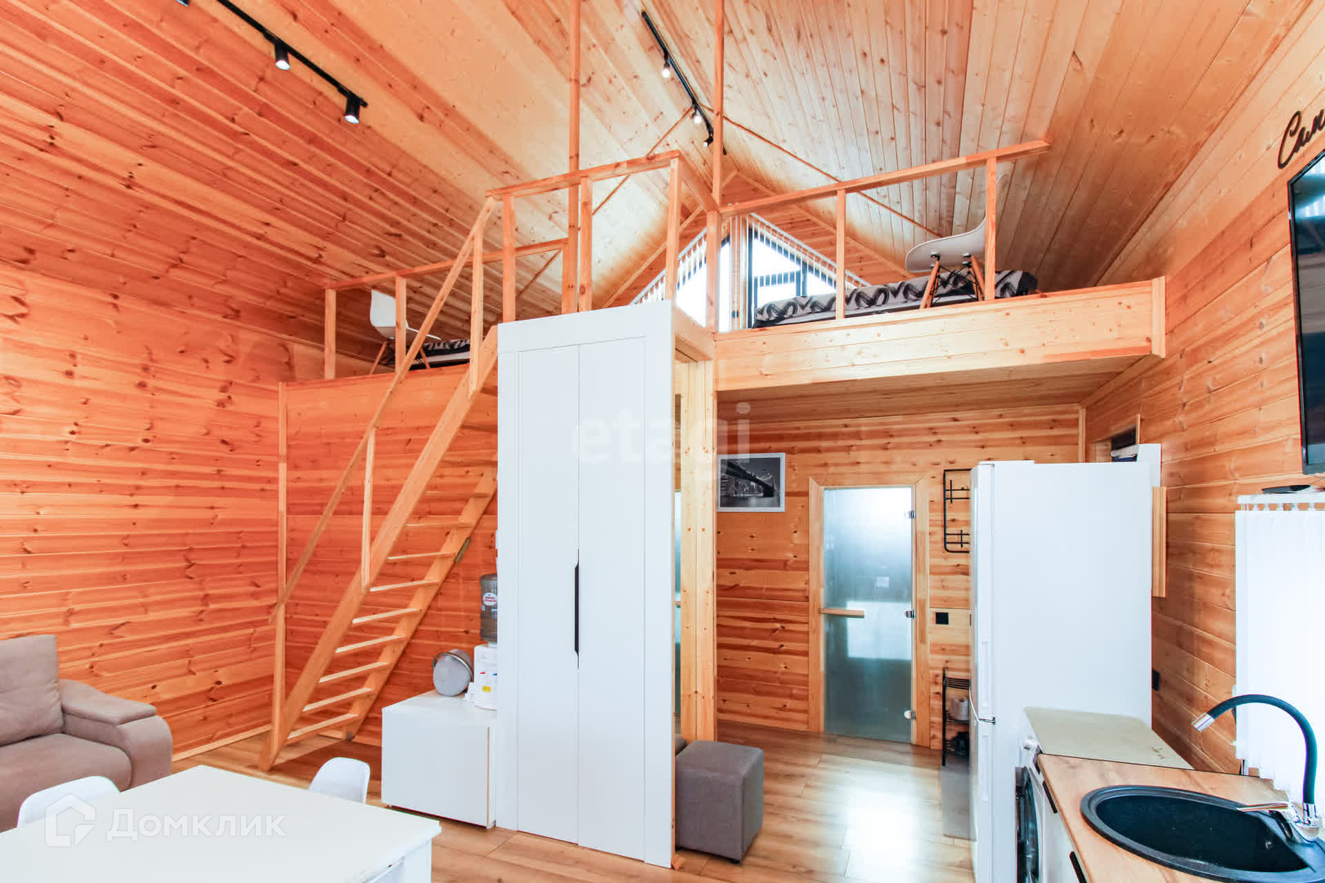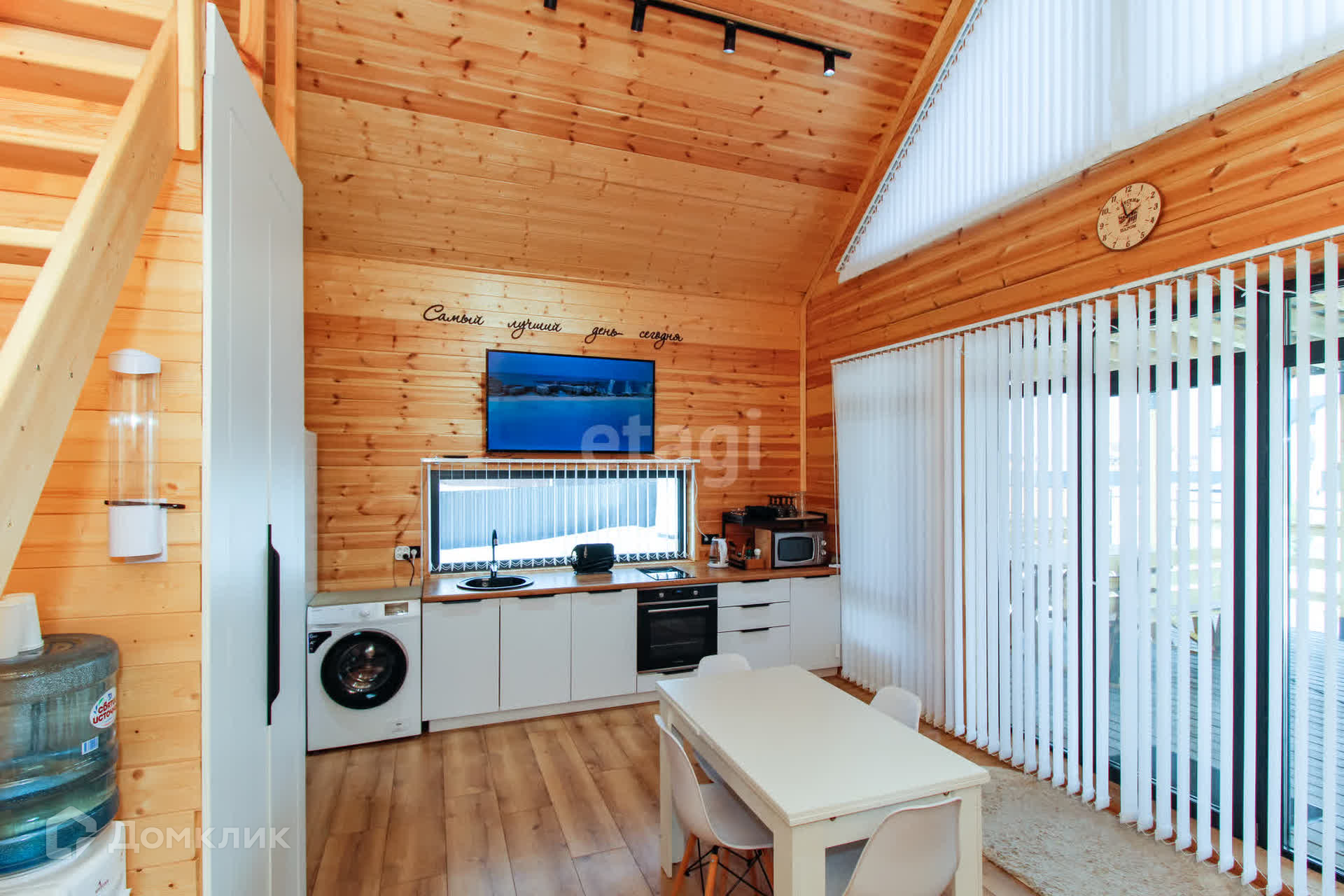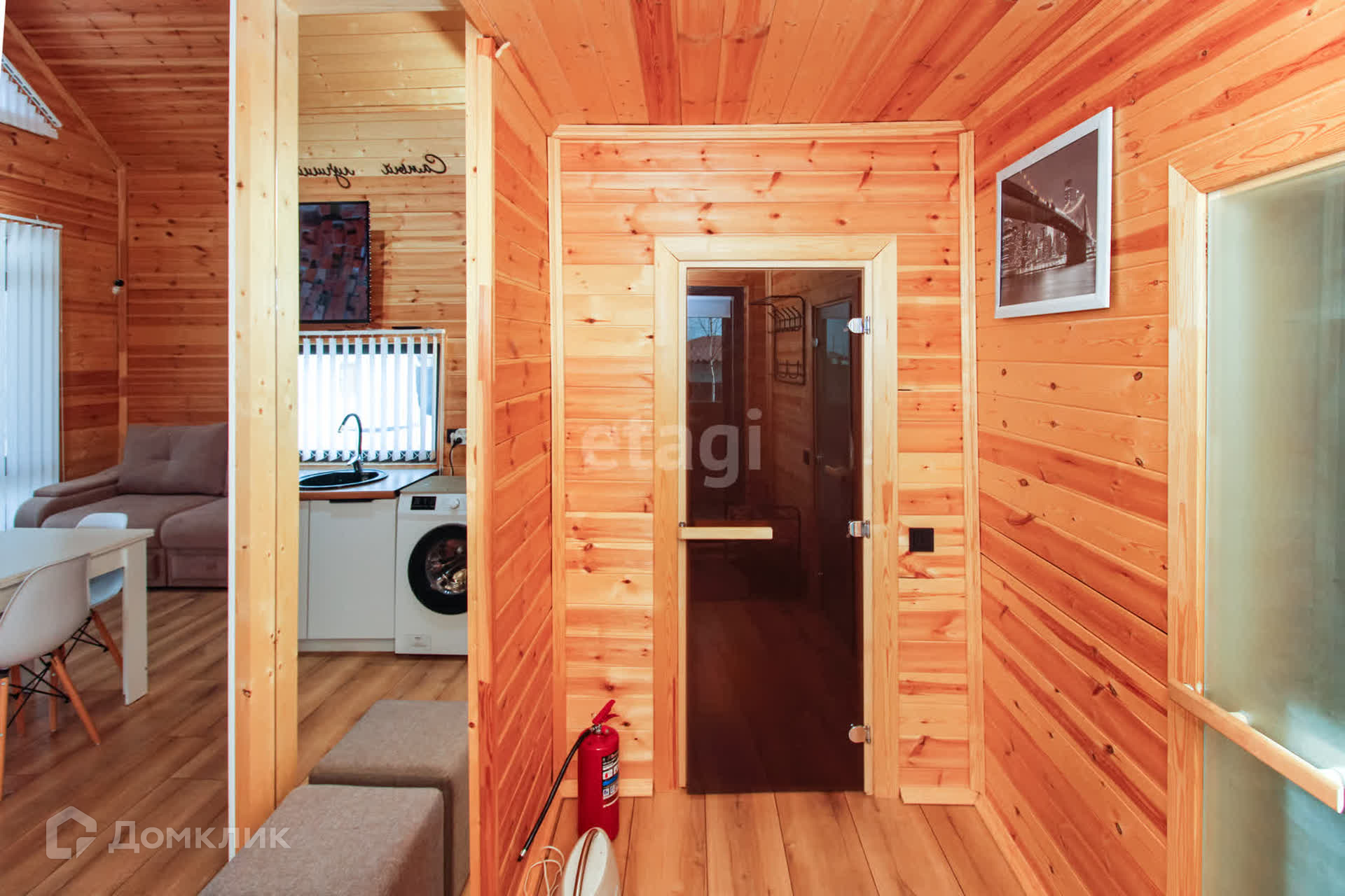 Дом - 1 ЭТАЖ - финская сауна, раздевалка, душ, туалет, кухня-гостиная с посудой, 2-спальный диван, раздвижной стол, стулья, холодильник с морозильной камерой, стиральная и посудомоечная машины, духовой шкаф и варочная панель, микроволновая печь, чайник, кулер с водой, WI-FI, смартТВ