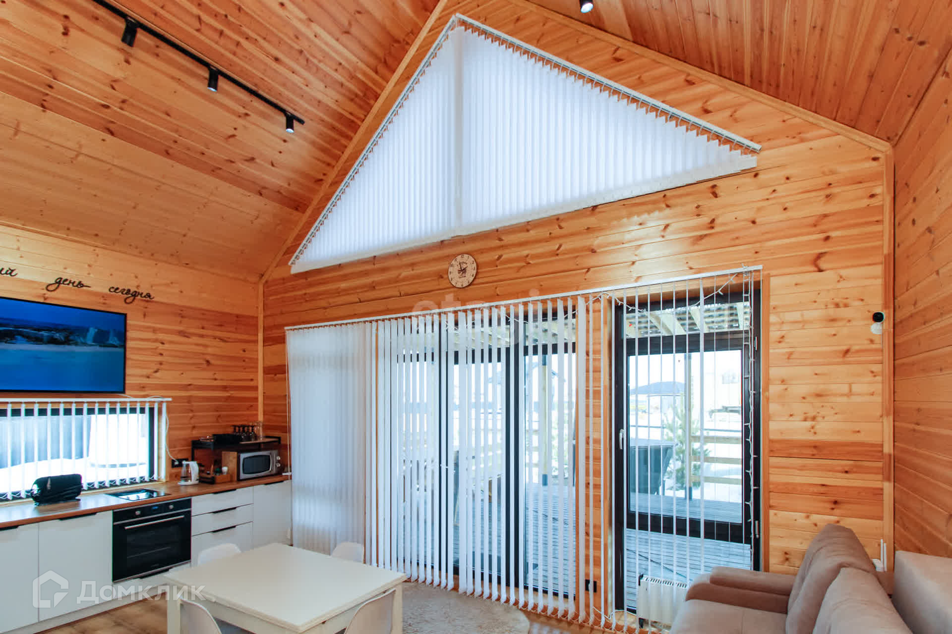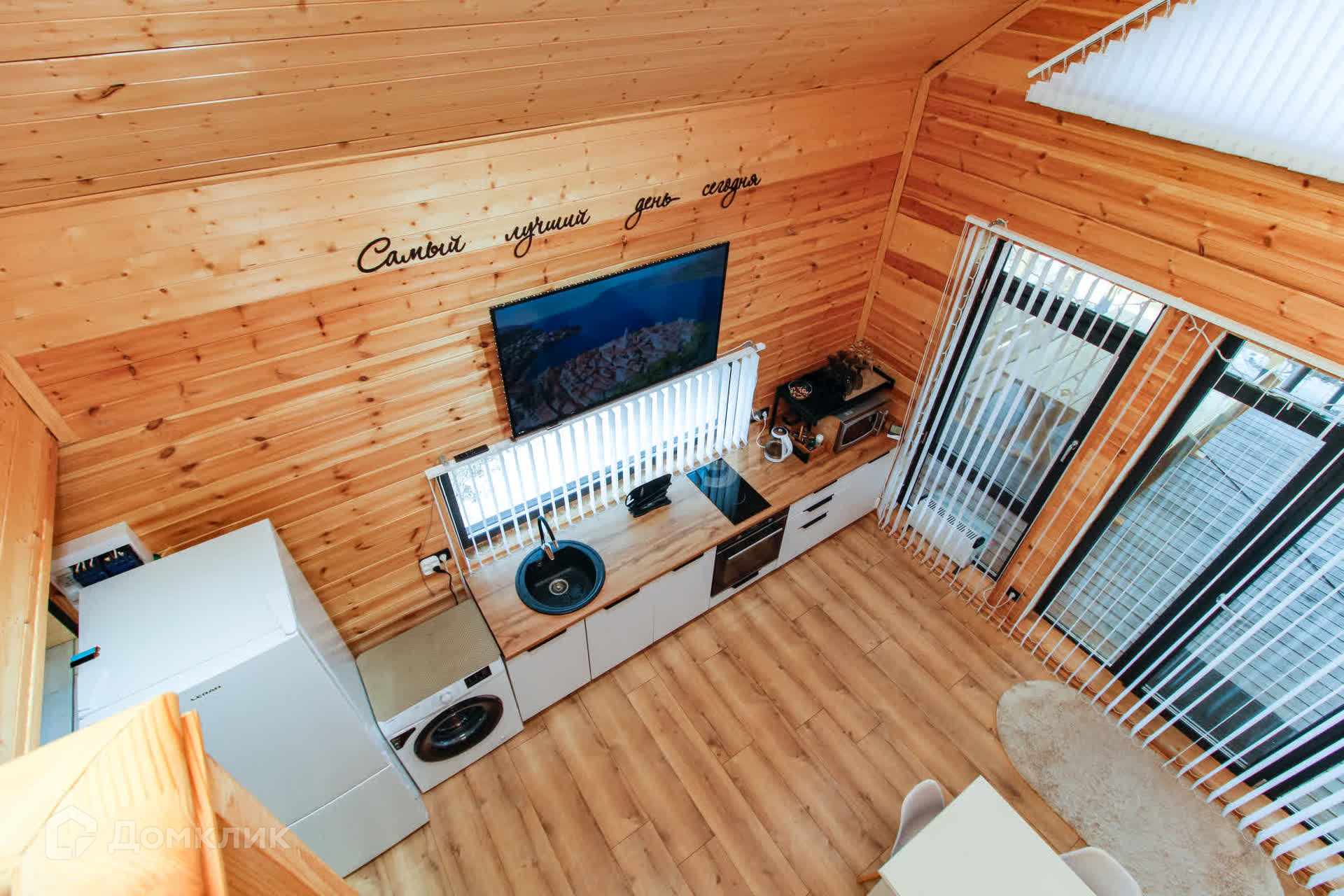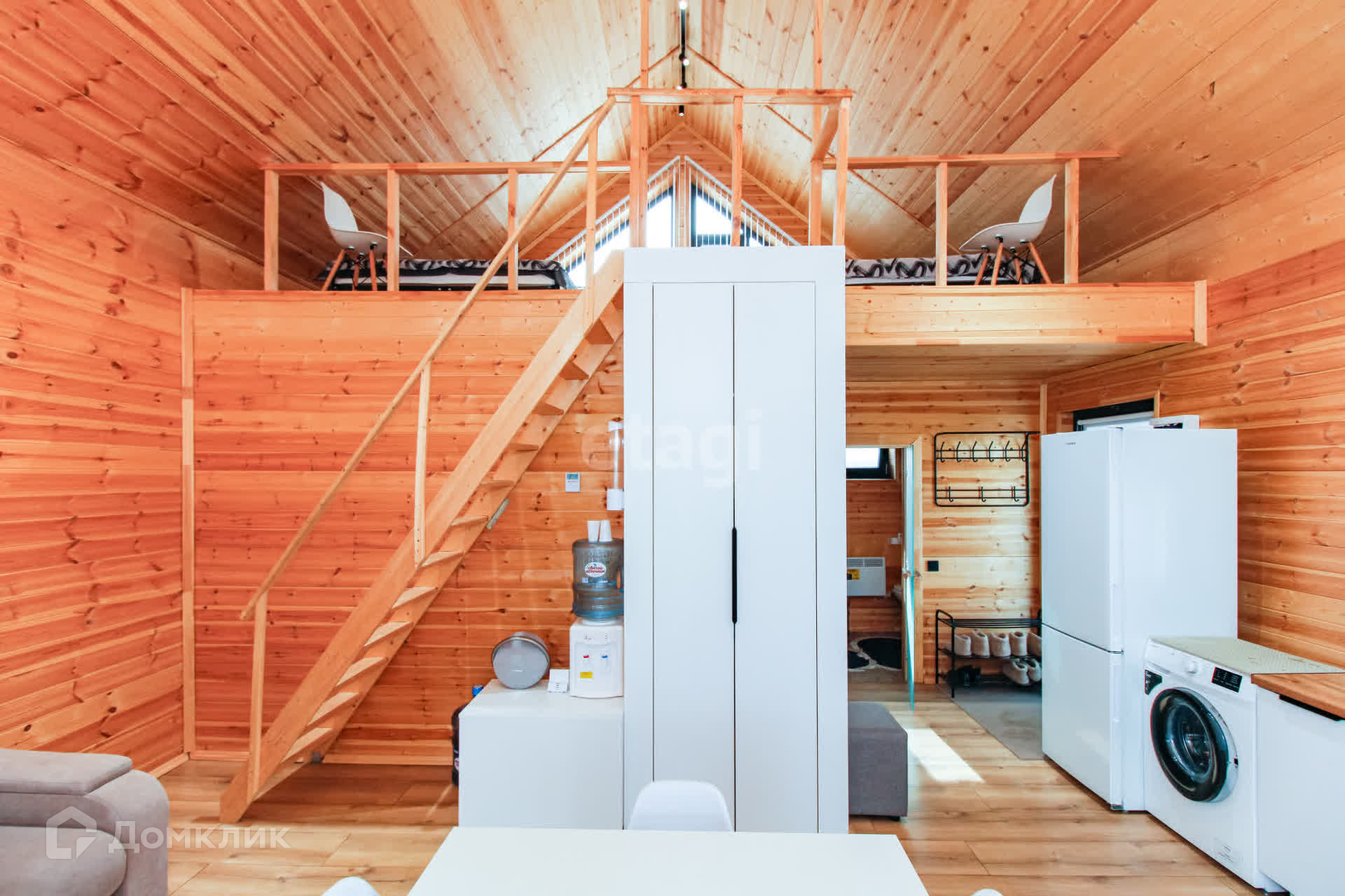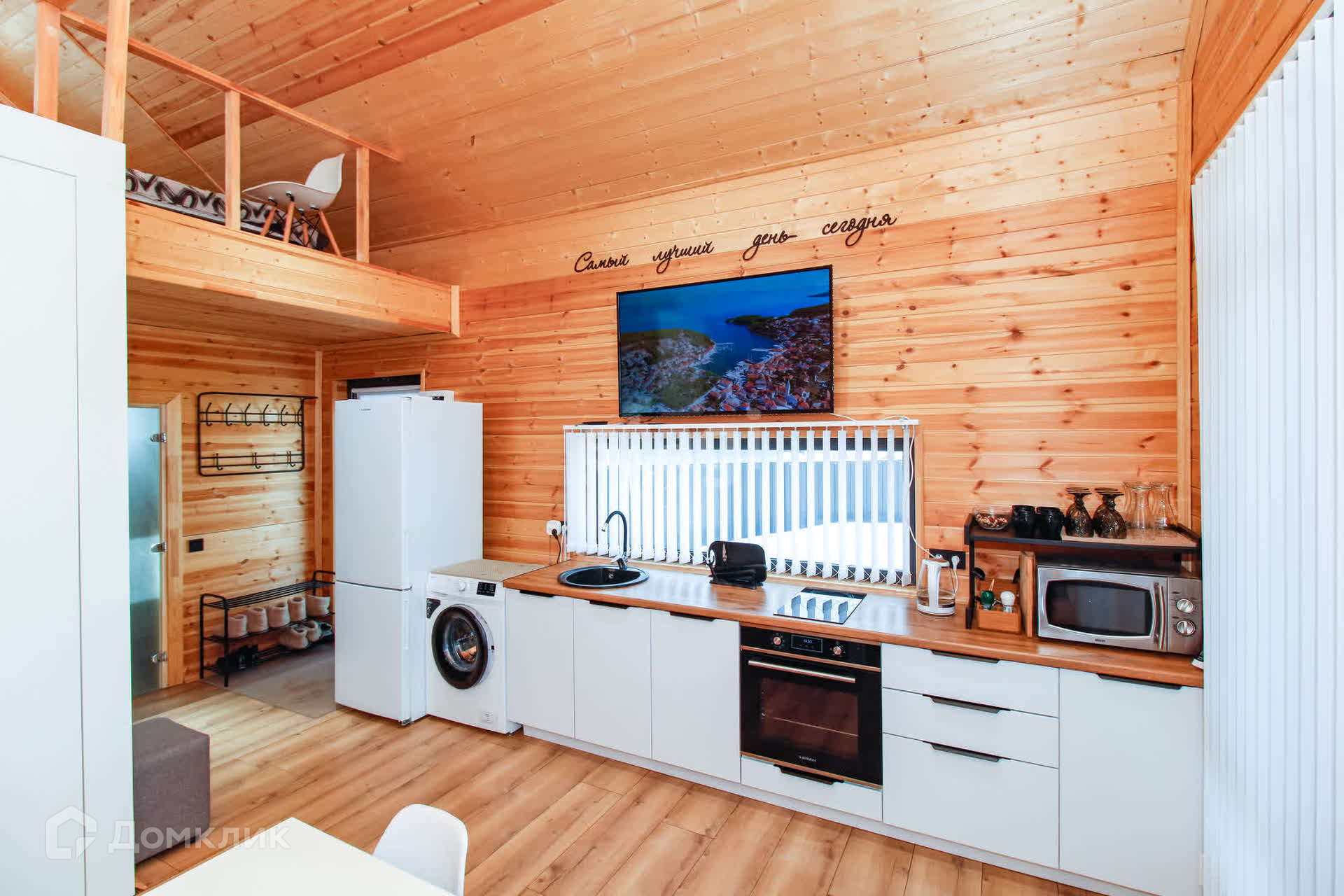 Дом - 1 ЭТАЖ - финская сауна, раздевалка, душ, туалет, кухня-гостиная с посудой, 2-спальный диван, раздвижной стол, стулья, холодильник с морозильной камерой, стиральная и посудомоечная машины, духовой шкаф и варочная панель, микроволновая печь, чайник, кулер с водой, WI-FI, смартТВ