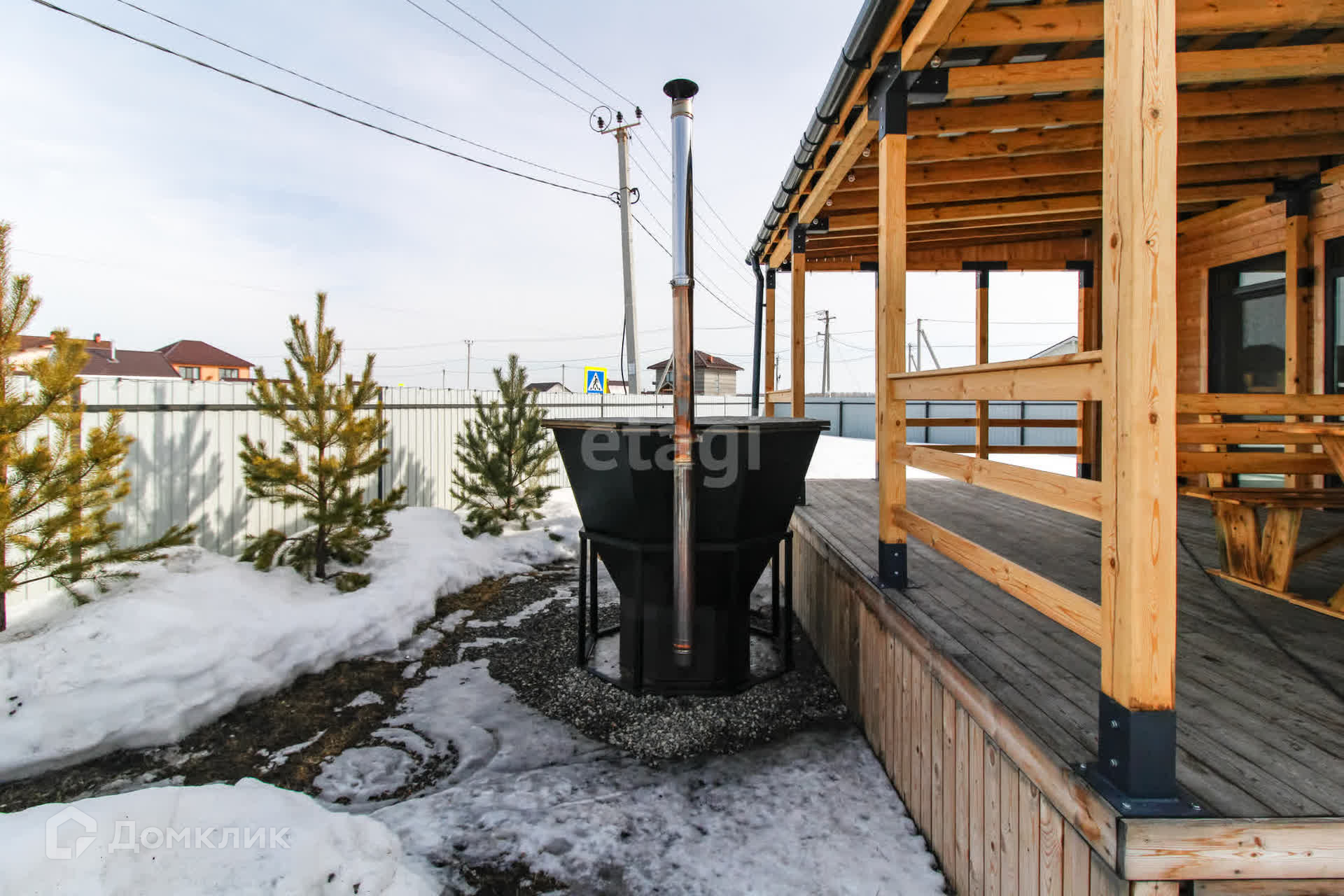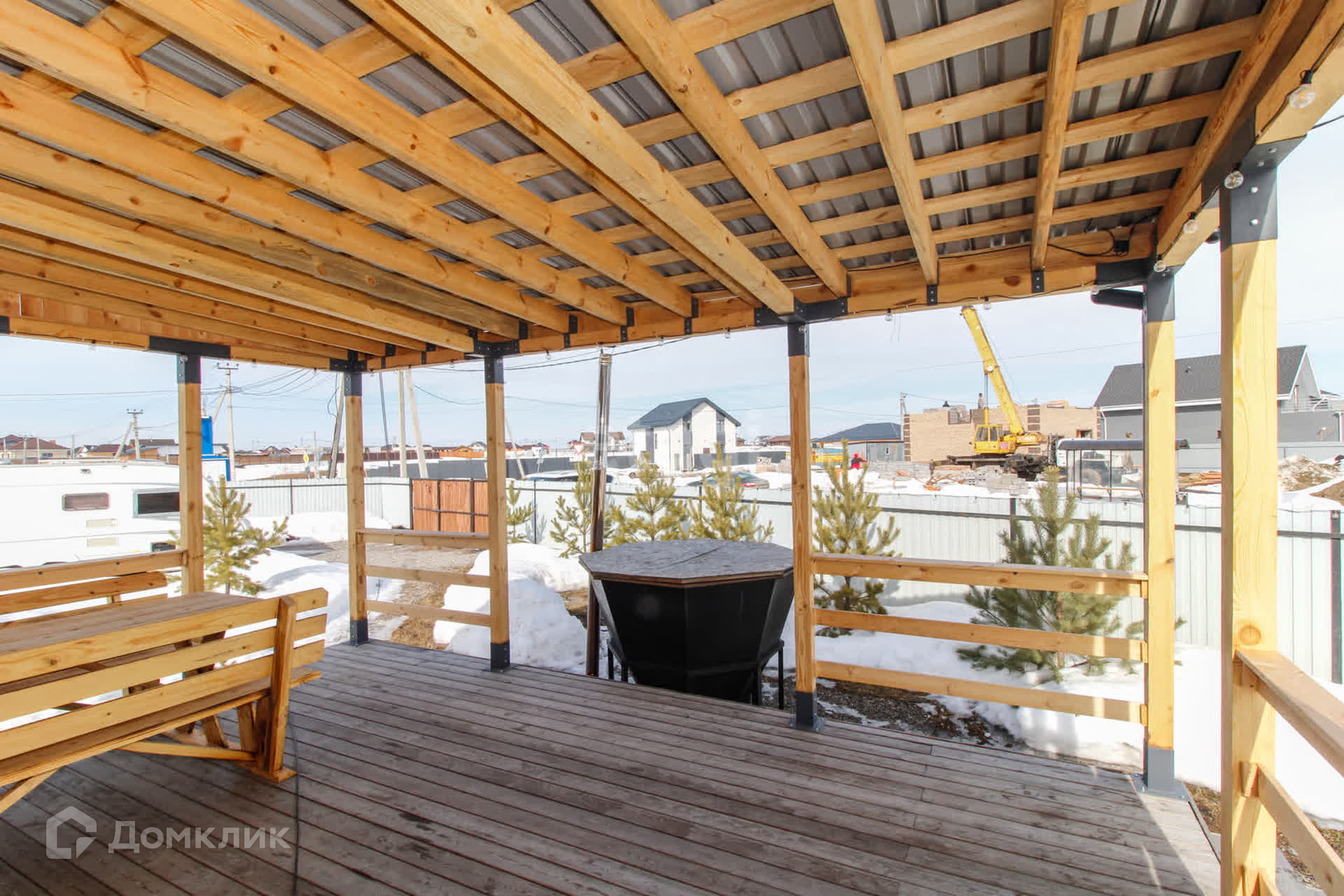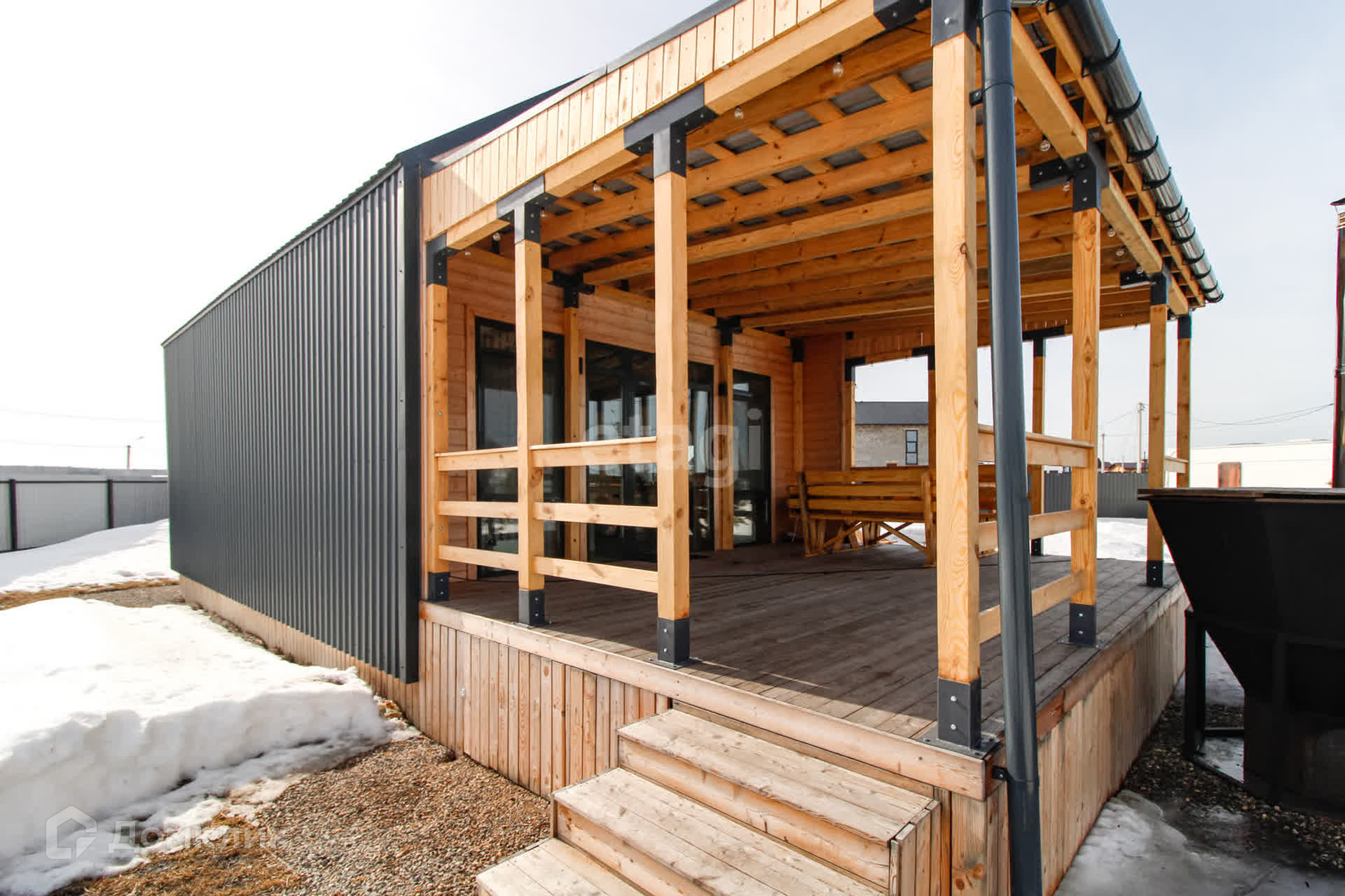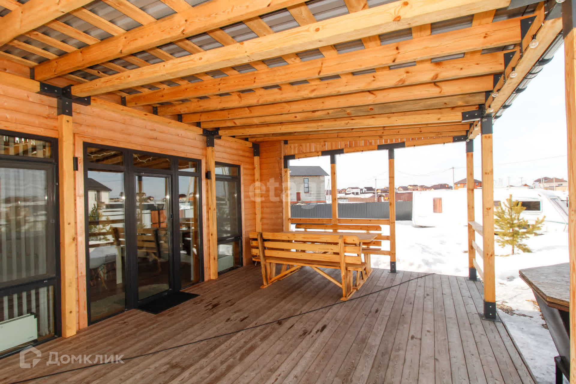 - яркая терраса с навесом и мебелью