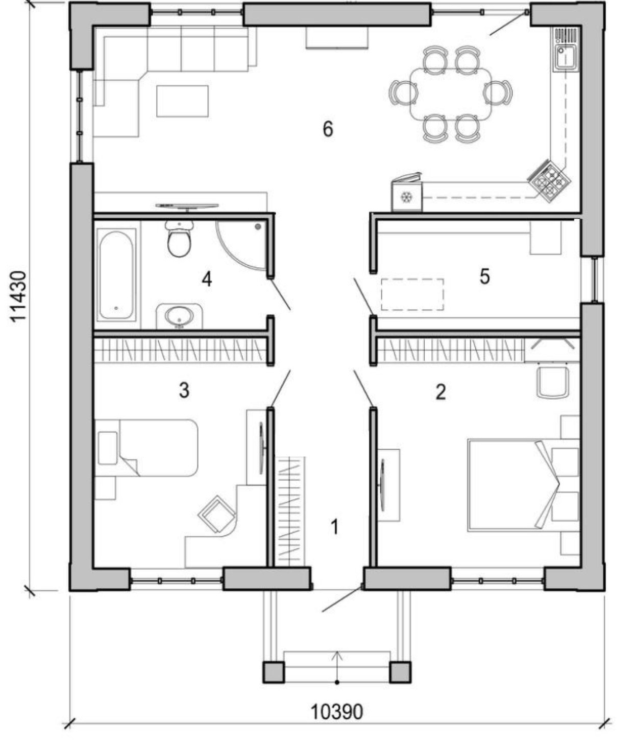 Прихожая, две спальни, котельная, санузел, просторная гостиная с кухней и выходом на задний двор (при желании можно сделать веранду).