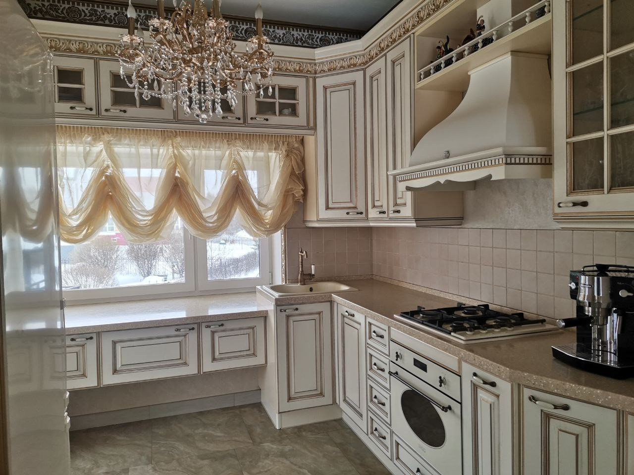 1-этаж- Холл, прихожая. Гостиная обеденный стол,  камин , кухня изготовлена по заказу студией Верона . Холодильник с морозильной камерой LG, микроволновая печь с грилем, варочная поверхность Smeq (Италия) посудомоечная машина и вытяжка Smeq (Италия). Санузел.