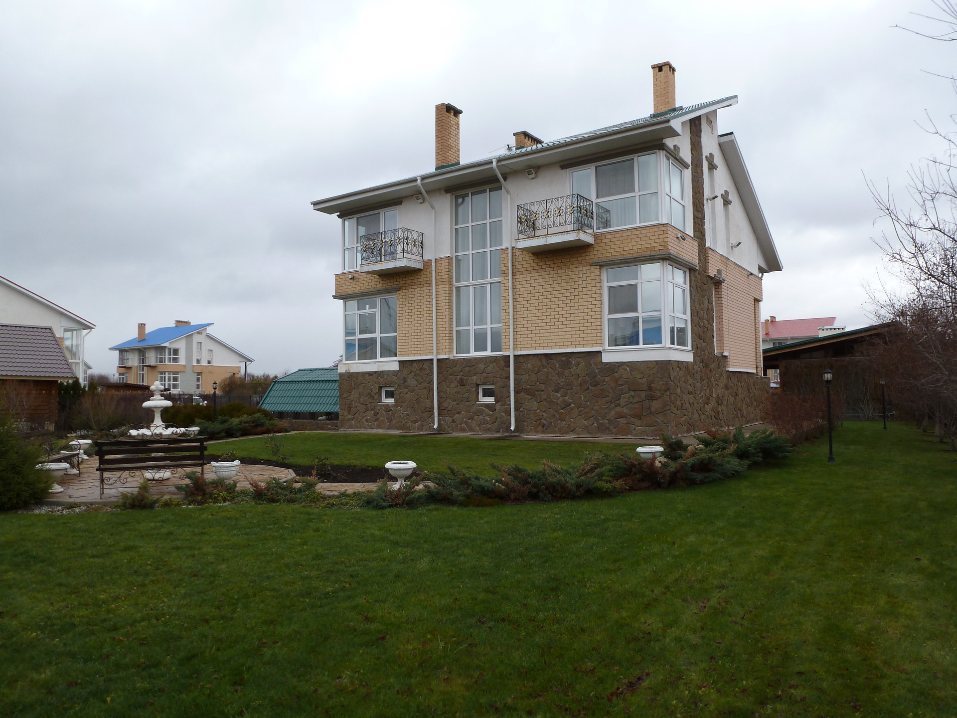 Общая площадь кирпичного дома составляет 250 квадратный метров, полностью меблирован и готов к круглогодичному проживанию. В отделке дома использовались дорогие и качественные материалы (Германия, Испания, Италия). Лепной декор, натуральный гипс. Шторы, люстры, декор, все привозилось под заказ. Выполнена система видео наблюдения и противопожарной сигнализации. Второй свет в гостиной и действующий камин предает неповторимую атмосферу. Вы с удовольствием будете возвращаться в свой дом каждый день.