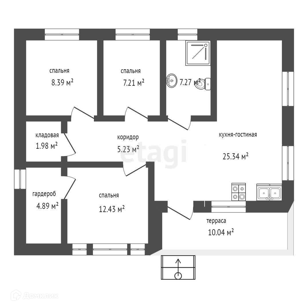 В доме располагаются 3 спальни, гардеробная, кладовая, санузел, большая кухня-гостиная и открытая терраса.