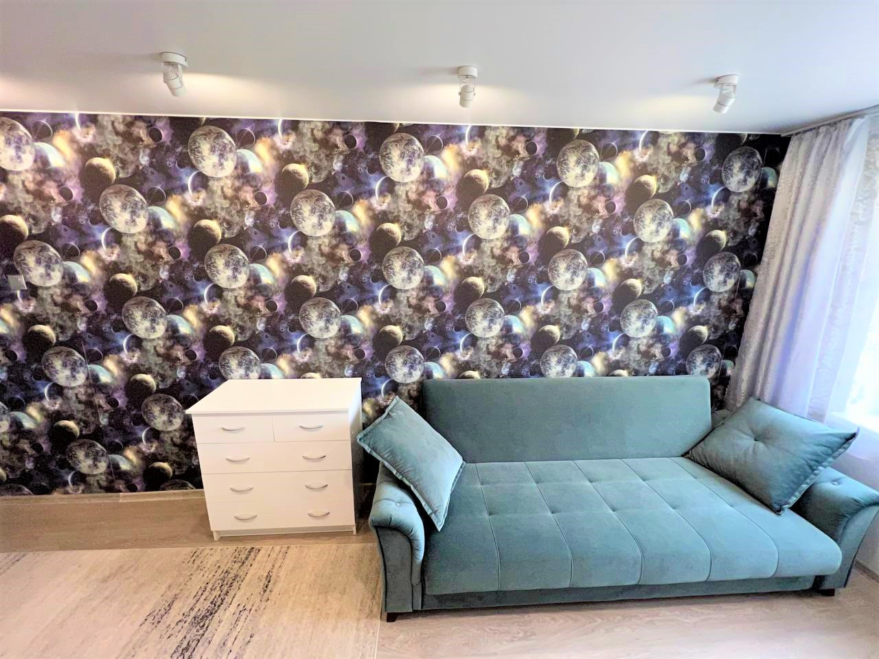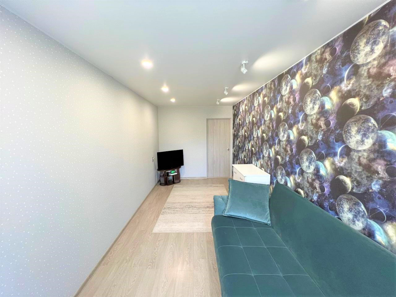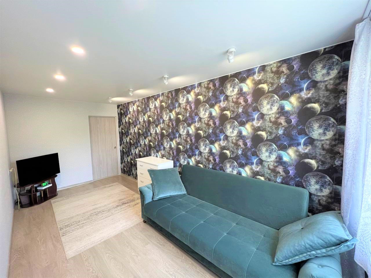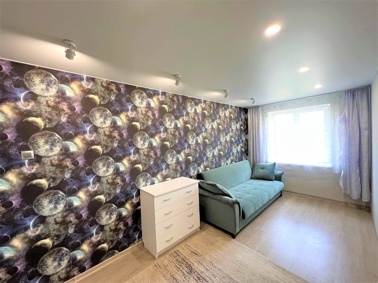 - Сделан хороший ремонт, комнаты изолированы, окна выходят на обе стороны, в детской комнате сделан капитальный ремонт, включая замену полов (установили новые лаги и OSB-плиты 18 мм, постелили новый ламинат), а также добавили элемент умного дома, установив подсветку-споты, которые управляются с пульта, детская в стиле космоса;