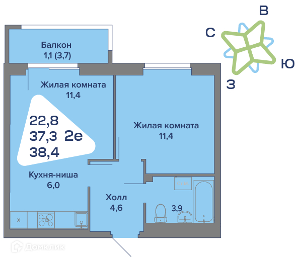 Общая площадь 38.5 м2