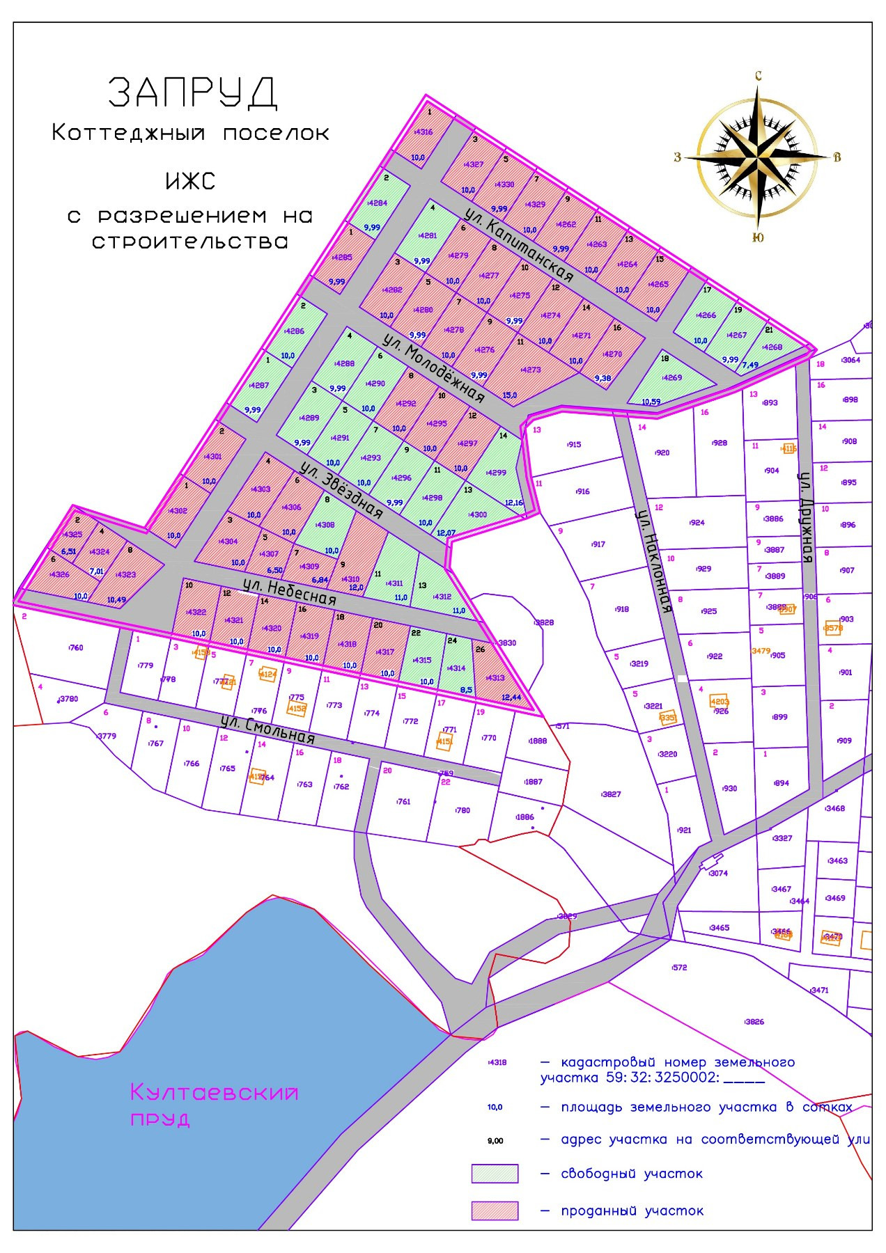 59:32:3250002:4432. ИЖС, сделана хорошая дорога, электричество, получено разрешение на строительство, в шаговой доступности пруд. Так же есть другие участки (обозначены зеленым цветом в схеме). Идет активная застройка.