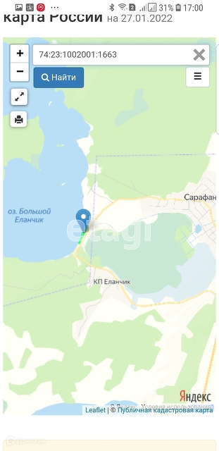 Продается земельный участок 1,76 га, в санаторно-курортной зоне, расположенный на берегу озера Большой Еланчик. Данный участок вытянут вдоль озера. Расположен между Закрытым поселком Еланчик и д. Сарафаново. Берег данного участка имеет заболоченность. Участок граничит с лесным массивом. Живописное озеро, пятое по чистоте воды озеро в Челябинской области. Является гидрологическим памятником живой природы. Особо охраняемая природная территория Челябинской области. Вода в озере лечебная, по составу — минерально-щелочная. Прекрасное место для инвестирования.