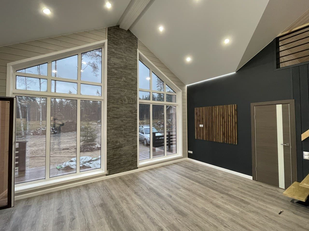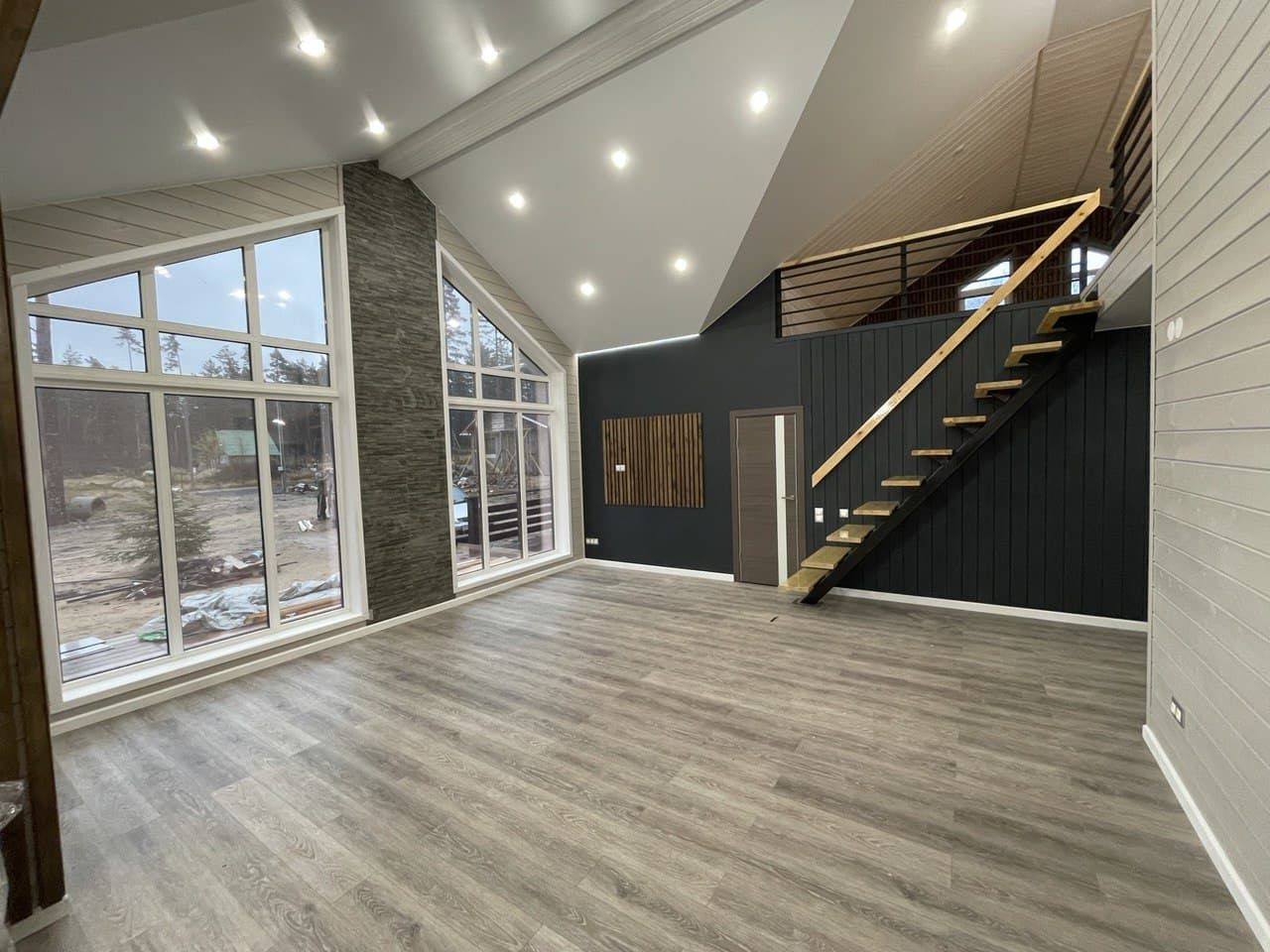 1 эт. гостиная с зоной кухни, три комнаты, сан узел. 2эт - комната, холл, гардеробная.