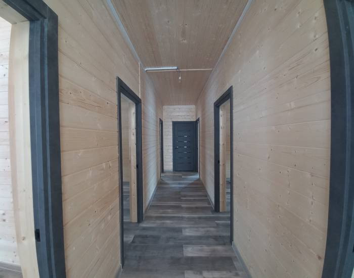 Идет внутренняя отделка. Пол - ламинат, межкомнатные двери. Установлена сан техника.