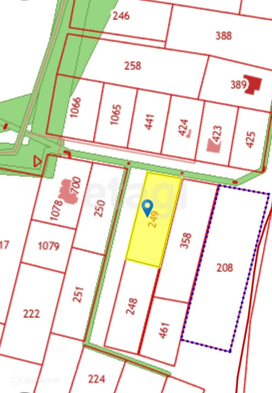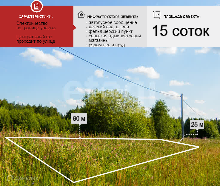 Участок удобной прямоугольной формы (60*25 м). Центральные коммуникации: свет, газ, вода проходят по границе участка. Хороший круглогодичный подъезд. Категория земель: земли поселений (земли населенных пунктов).