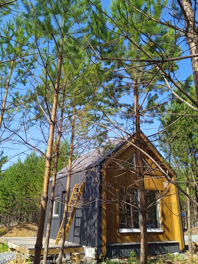 Планировка: кухня-гостиная, спальня на втором ярусе 8 м2, ванная комната, панорамное окно с видом на сосновый бор.