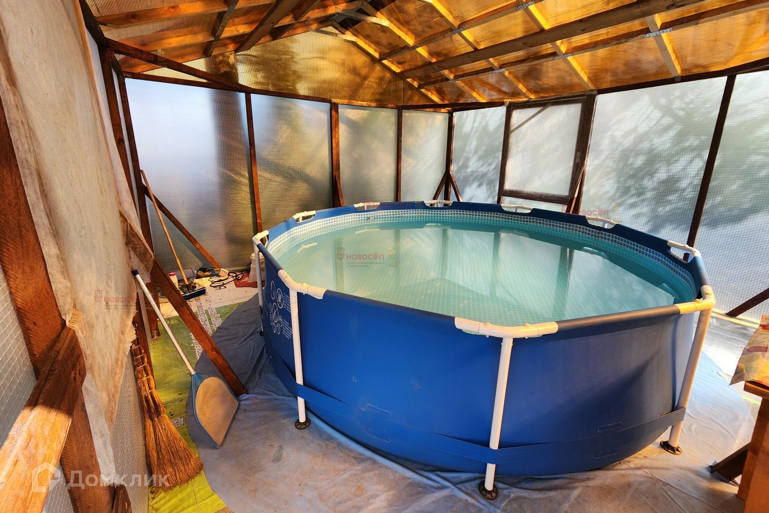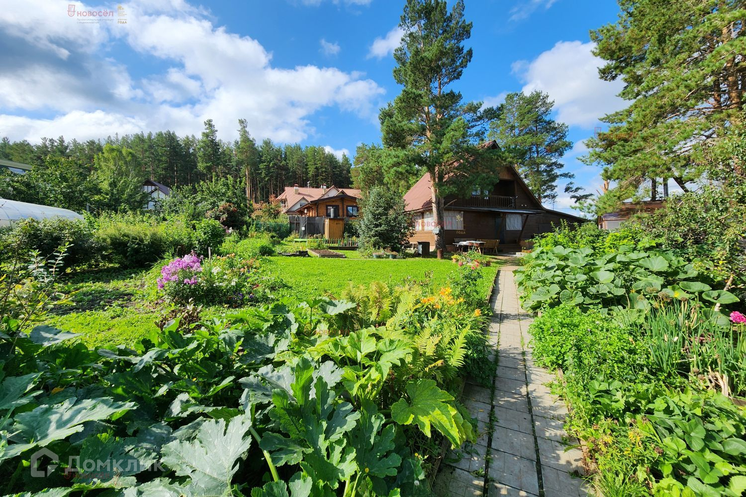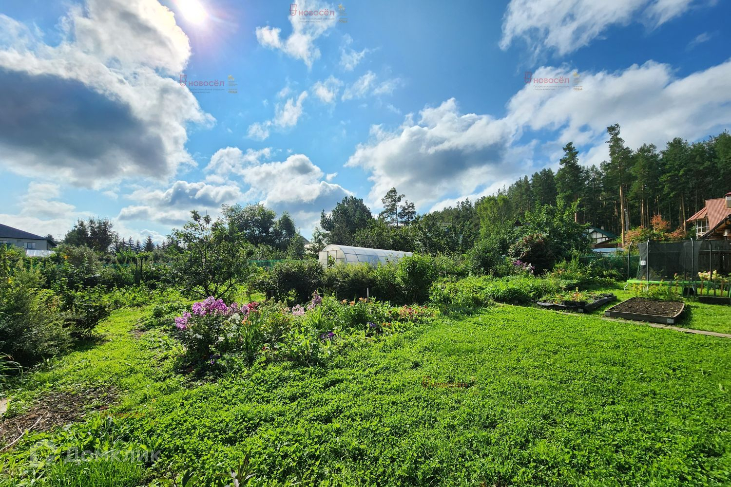 Участок разработан. На участке насаждения, крытый бассейн и баня. Дом находится на возвышенности.