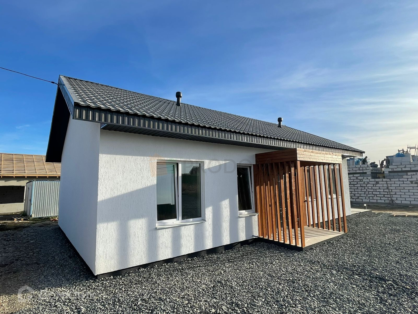 Фундамент: свайный ростверк на монолитной плите 320 мм. Стены: газоблок 300 мм., утеплитель пенопласт 100 мм., декоративная штукатурка "короед'. Крыша: металлочерепица, утеплитель задувная эковата 200 мм. Окна: тройной стеклопакет. Отделка " под чистовую ": ровные стены и пол под обои и ламинат, разводка электрики. Подведены и функционируют все коммуникации: электричество (15 кВт), скважина 50 м., канализация (септик два кольца с переливом), водоподготовка, вентиляция. Удобная планировка дома площадью 120 кв.м. позволяет комфортно чувствовать себя каждому члену семьи: холл, санузел, бойлерная с возможностью размещения еще одного санузла, 3 спальни, просторная кухня-гостиная с выходом на большую террасу.