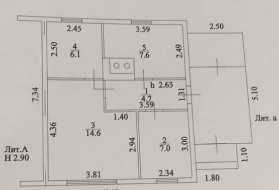 Состоит из трёх жилых комнат,кухни,туалет,ванная.