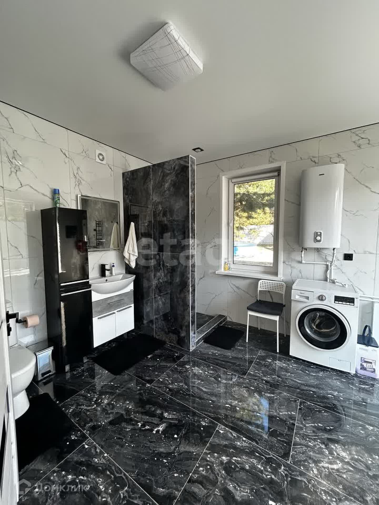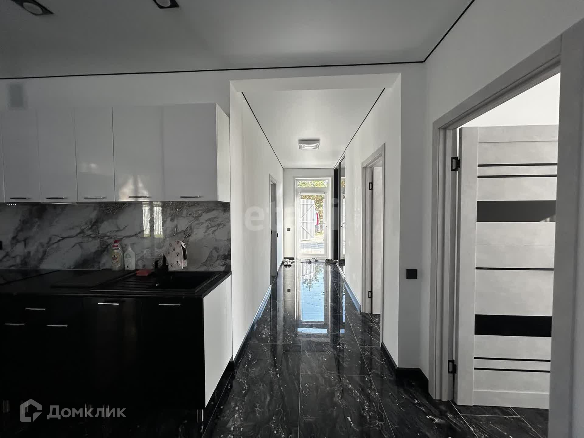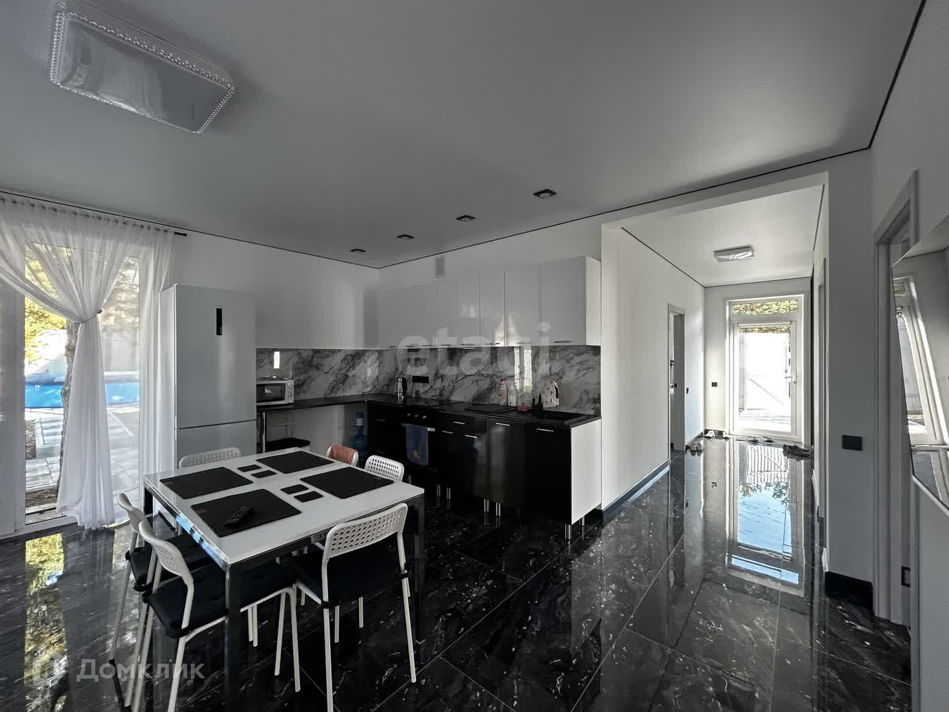 Открывая входную дверь в дом мы попадаем в чарующую и манящую атмосферу. Черный мрамор на полу в сочетании с белыми стенами смотрятся великолепно и дорого. Панорамное окно с выходом в сад создает состояние воздушности легкости и ощущения соединения с природой.