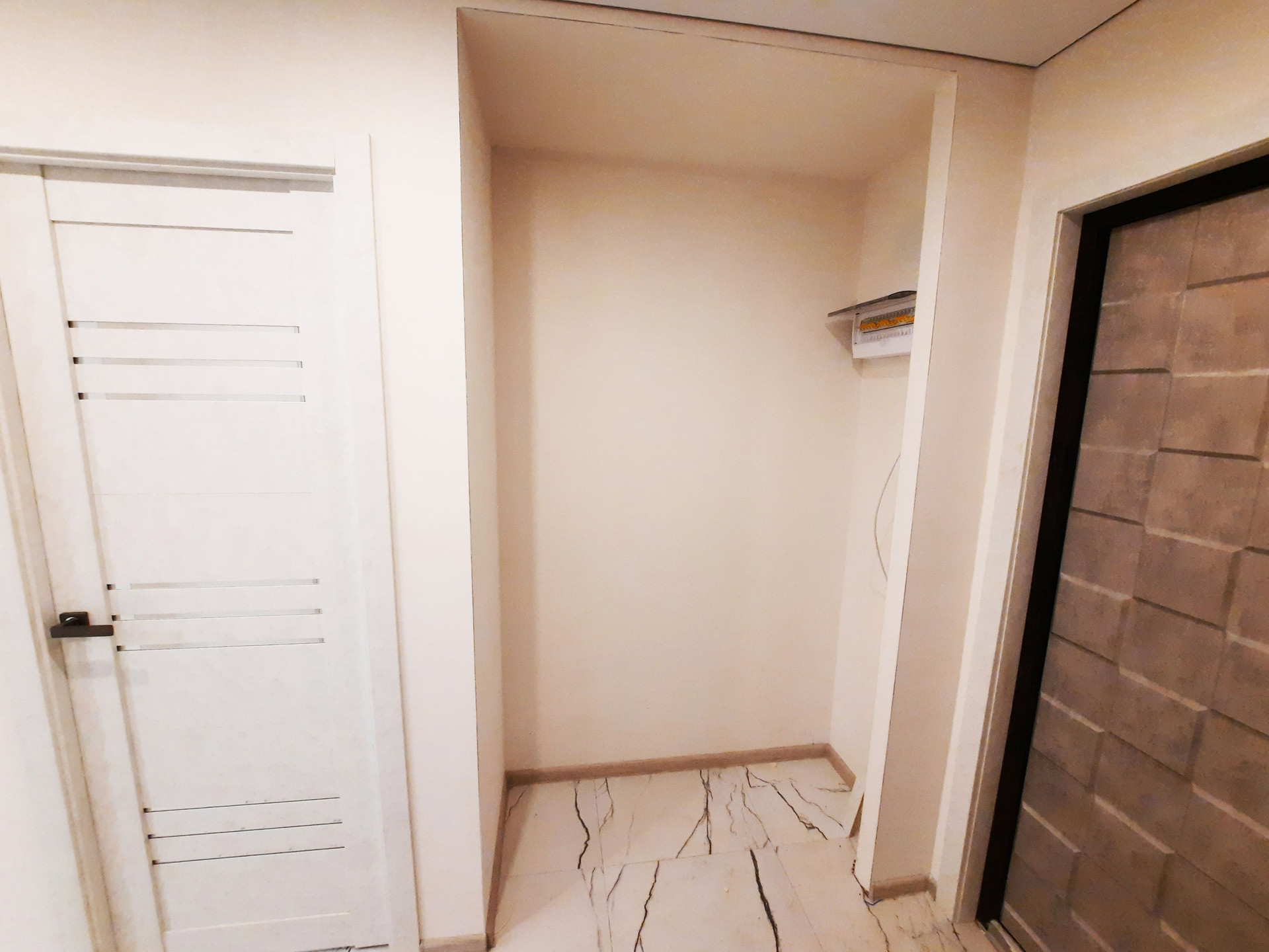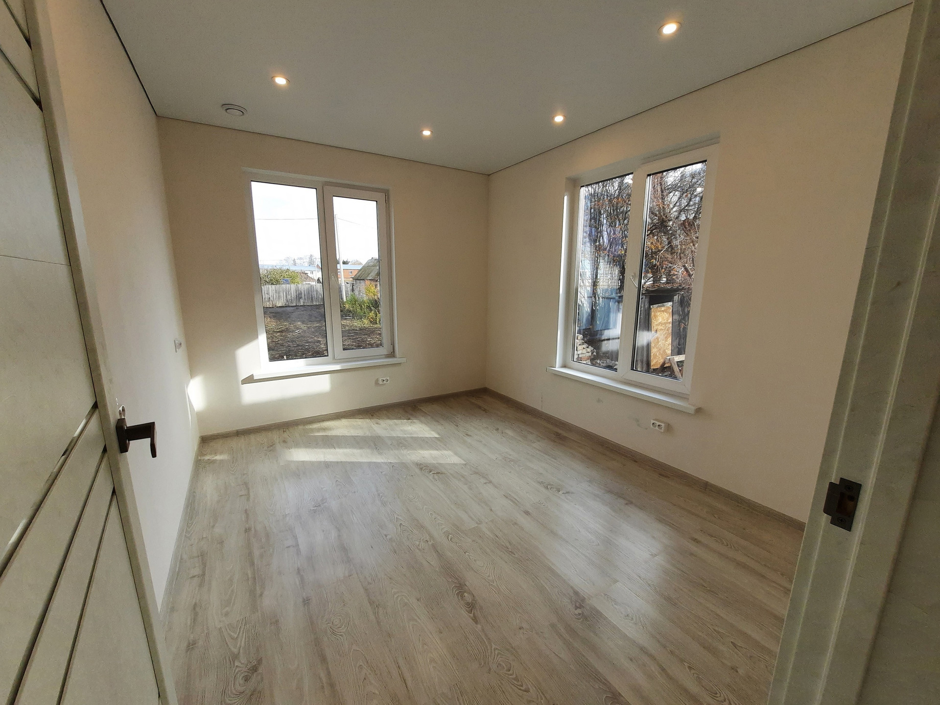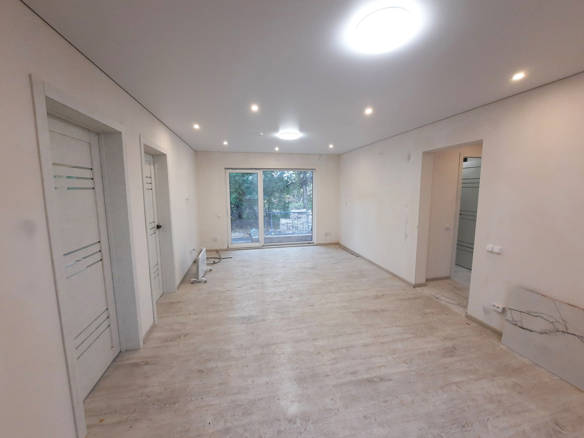 Белые стены, ламинат 33 класса, керамогранит в санузлах, добротные межкомнатные двери, натяжные потолки.