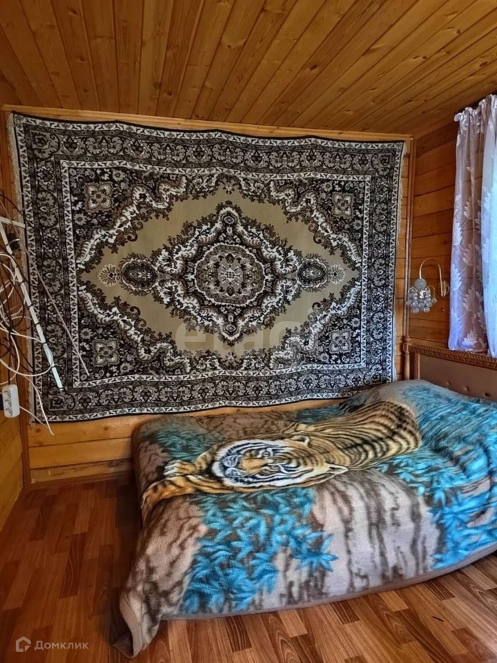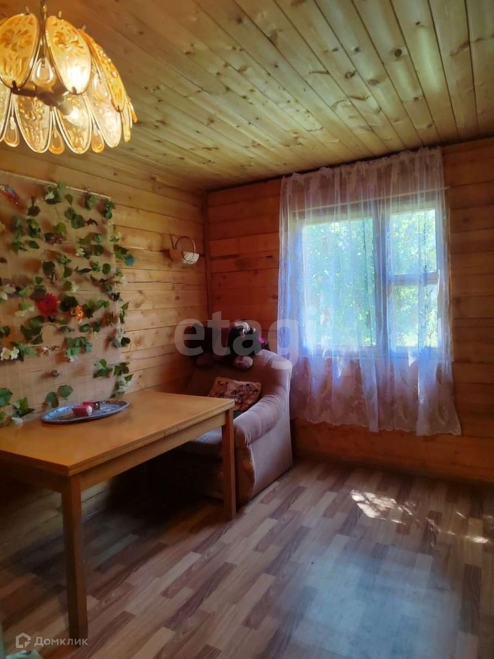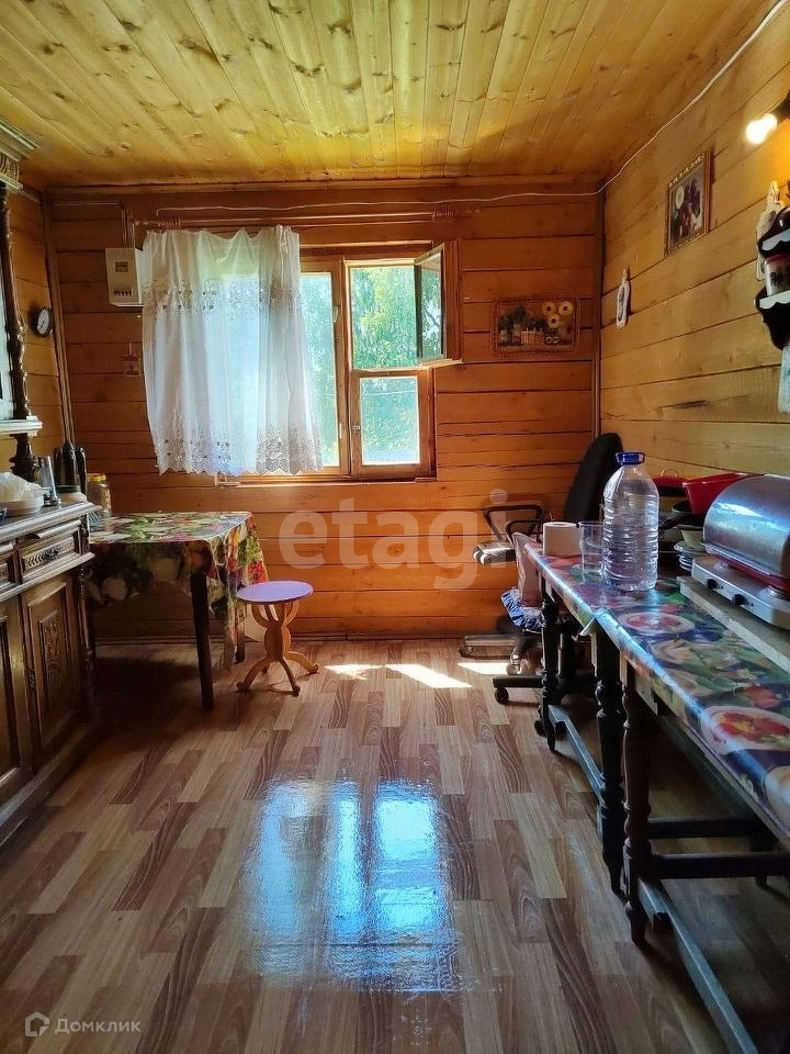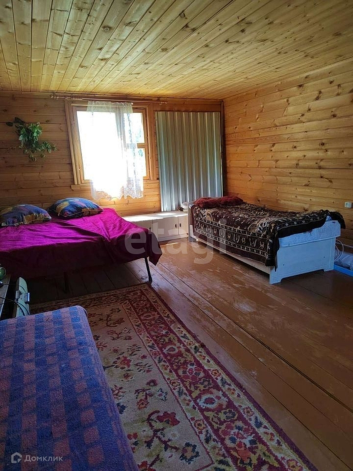На первом этаже застекленная терраса, кухня и спальная комната, второй этаж мансардного типа. На полу в доме постелен линолеум, внутренняя отделка стен - вагонка.