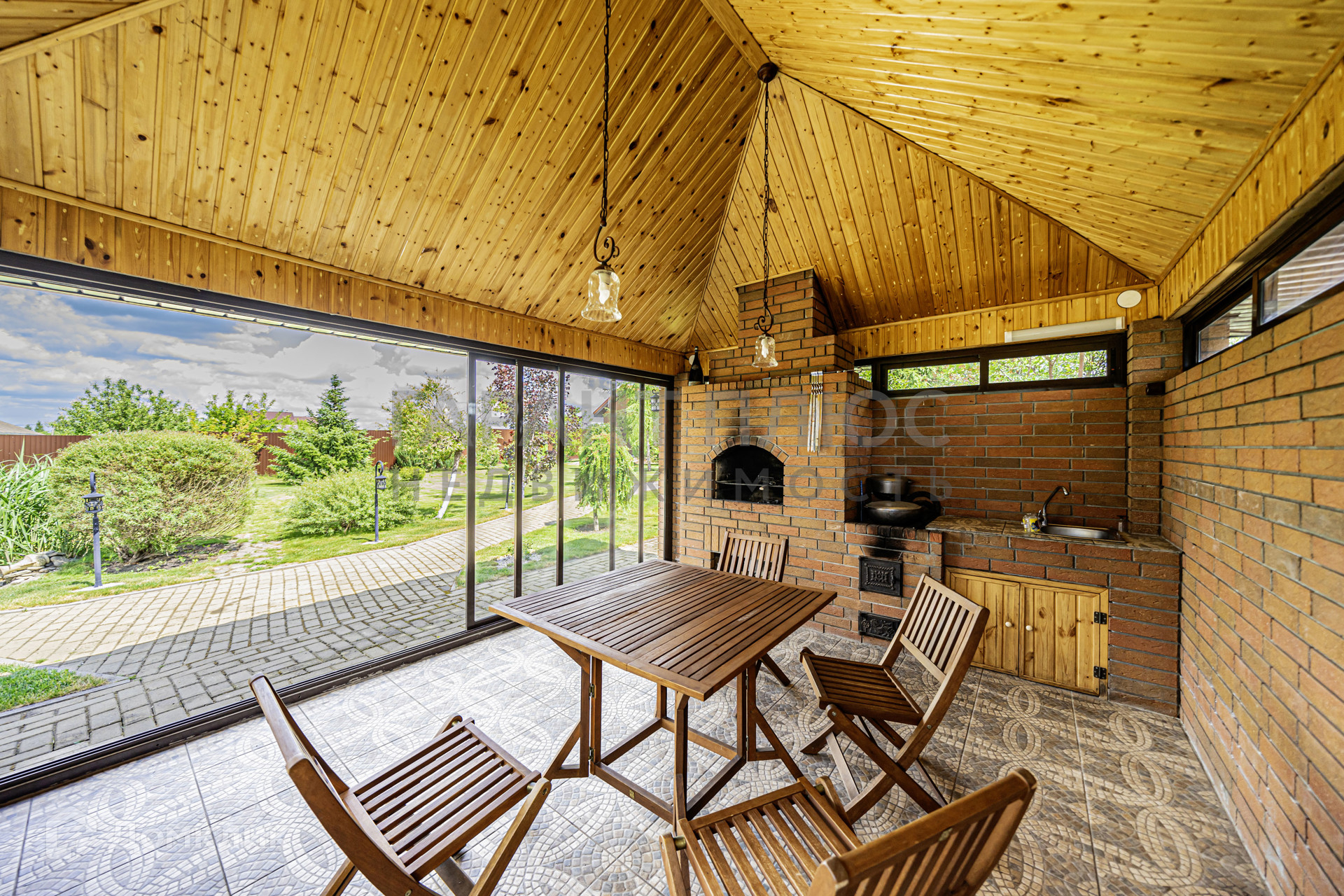 Большая закрытая зона барбекю с печью, с газоном и декоративными растениями, 2 сливных ямы 12 кубов, септик.