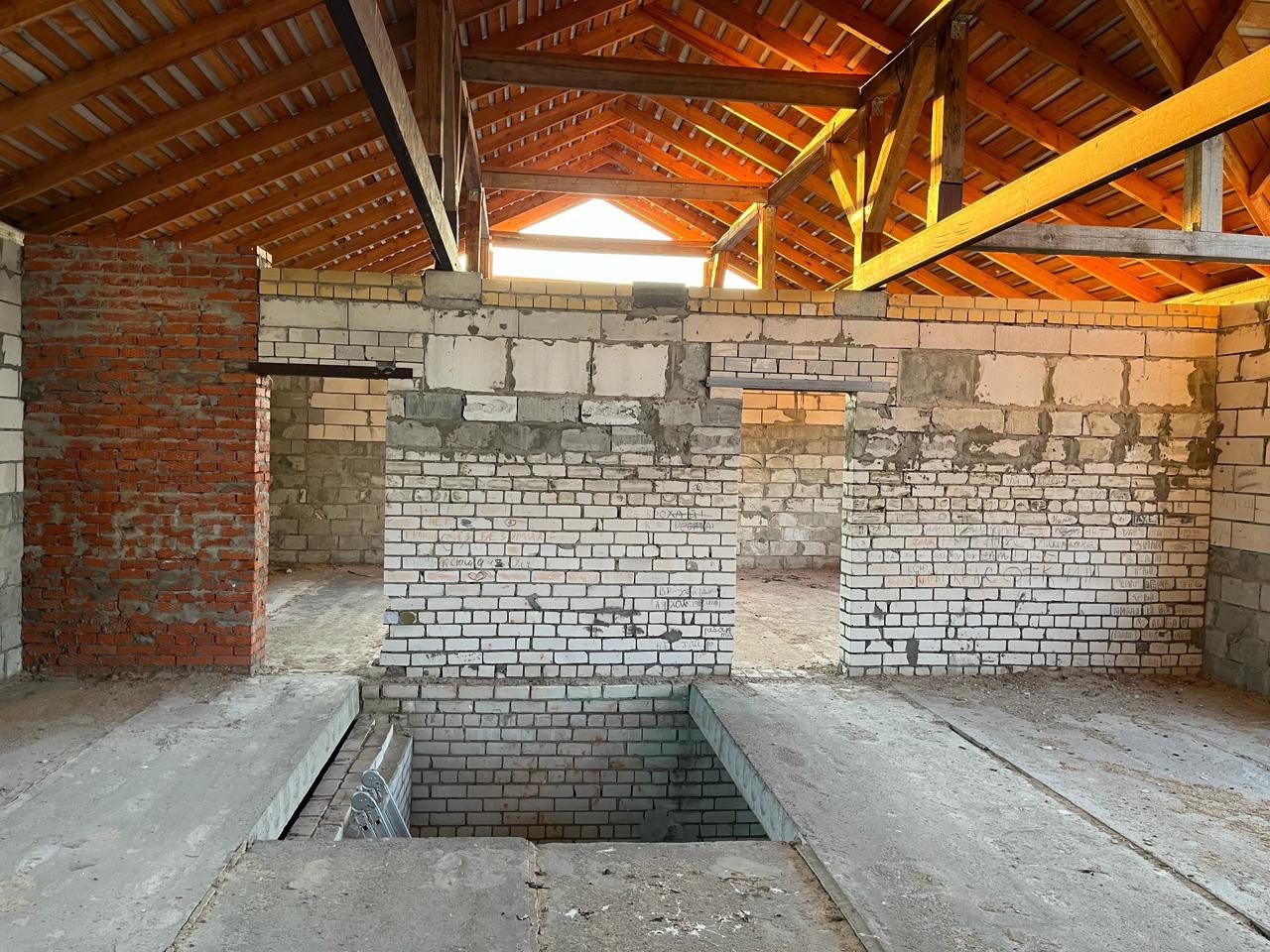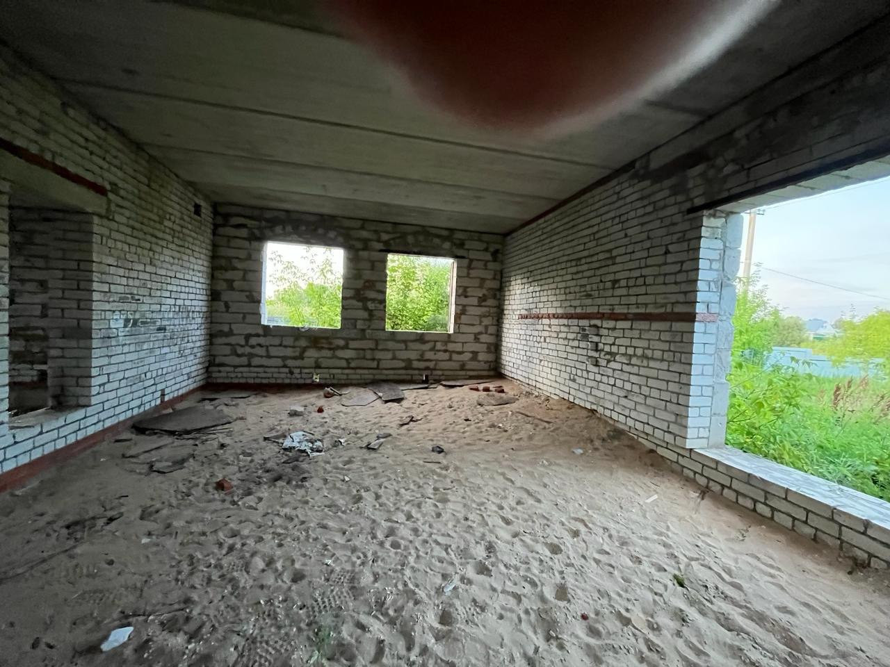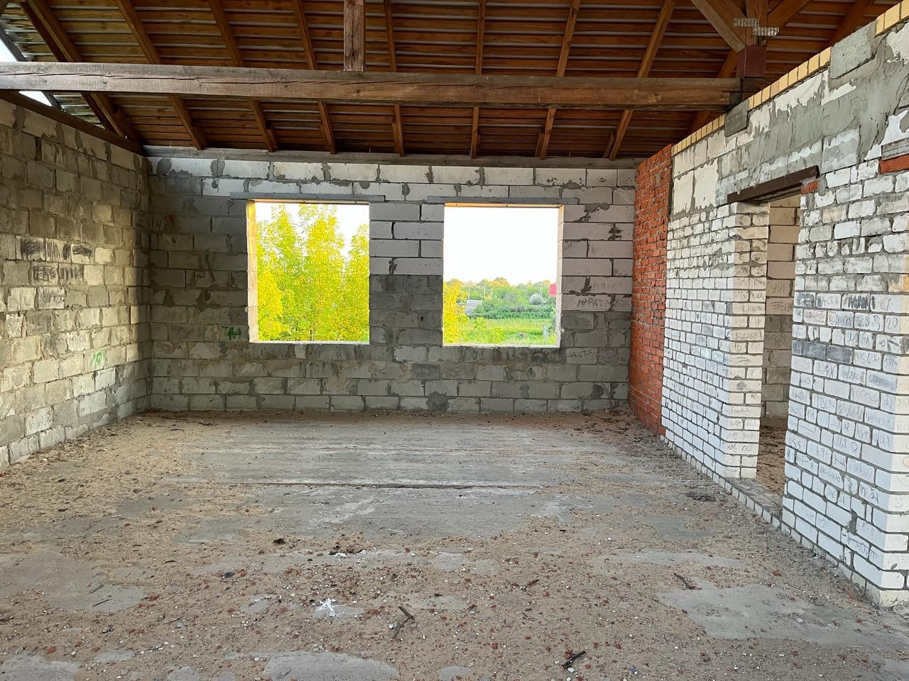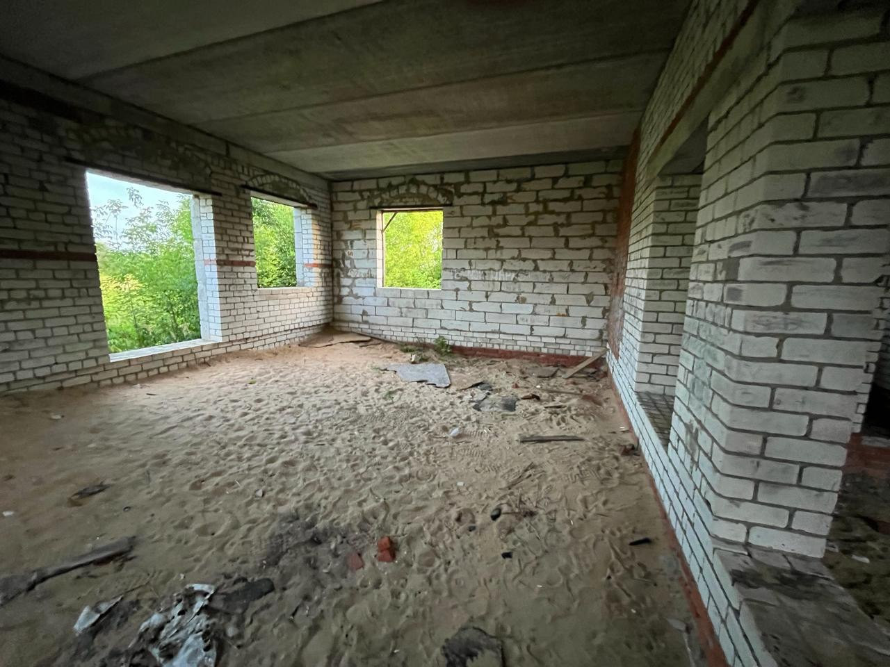 Дом из пенобетонных блоков и кирпича, под крышей (кровельное железо), перекрытия - железобетонные плиты. Газ на соседнем участке, свет у дома, канализация - местная (септик). Подъездные пути хорошие.