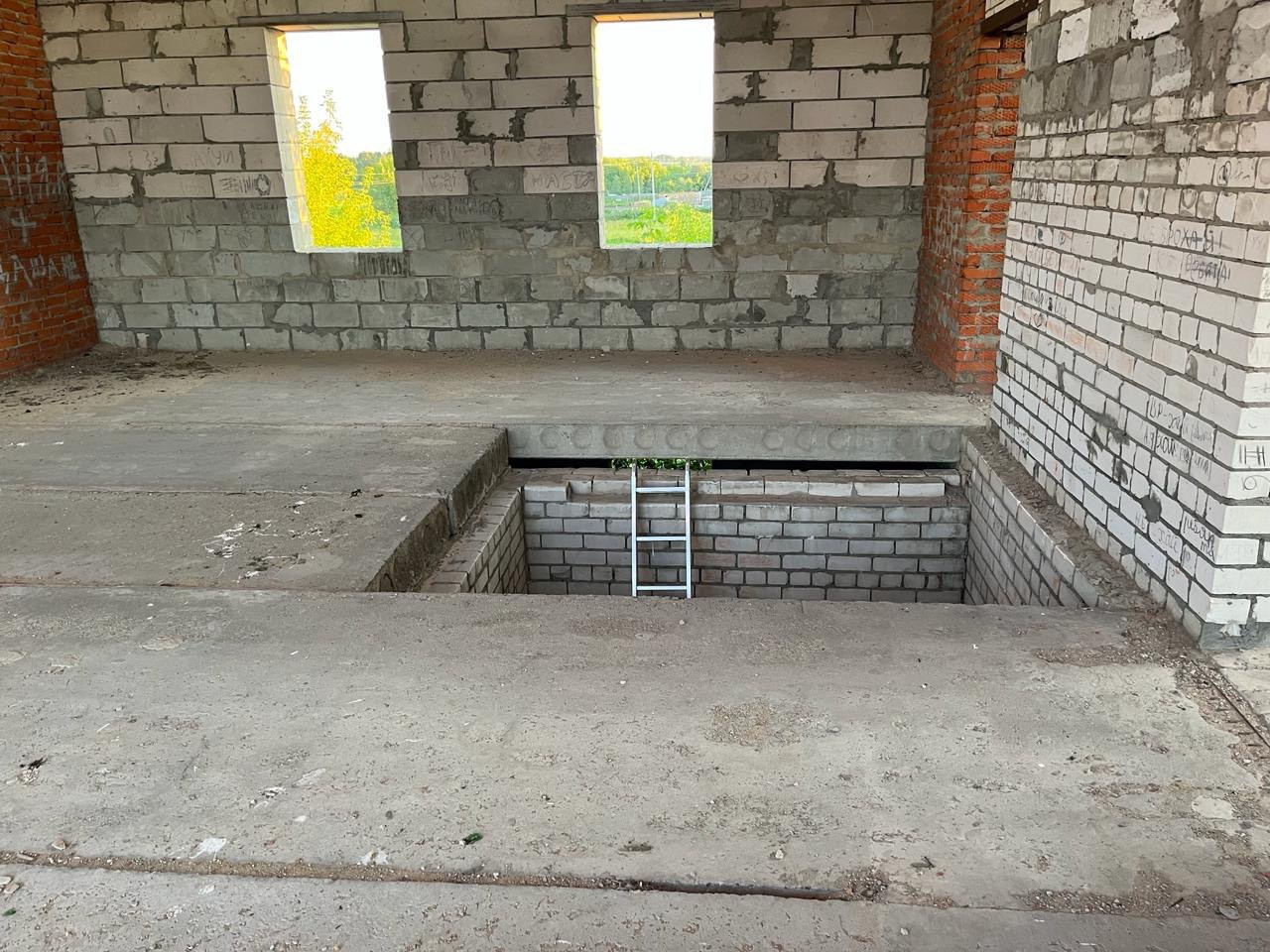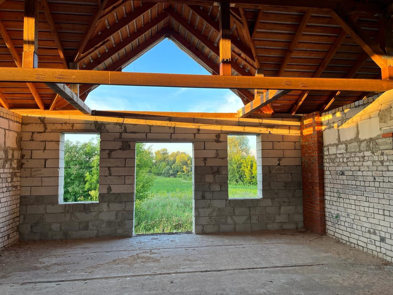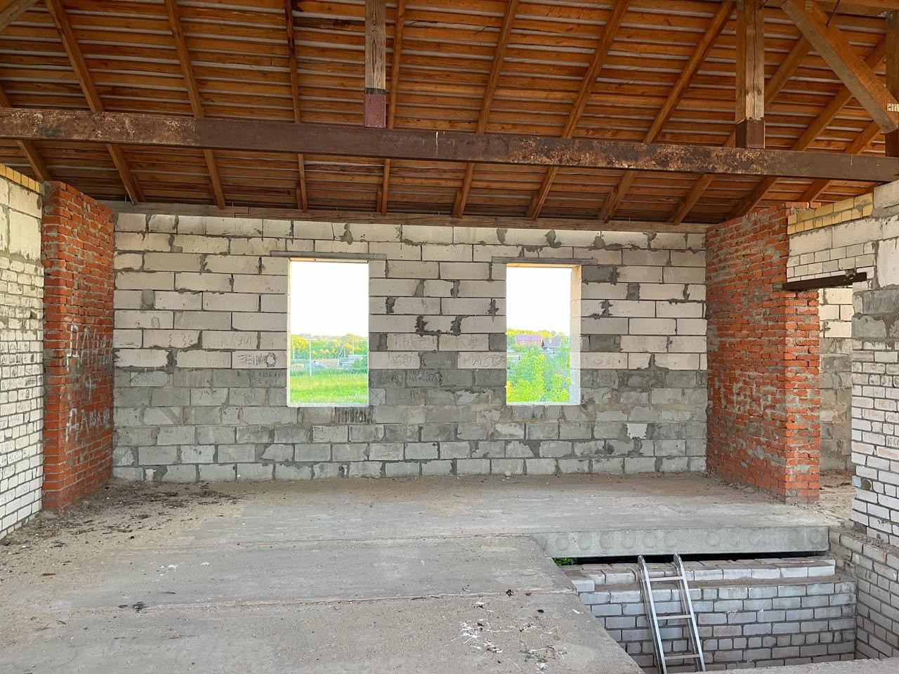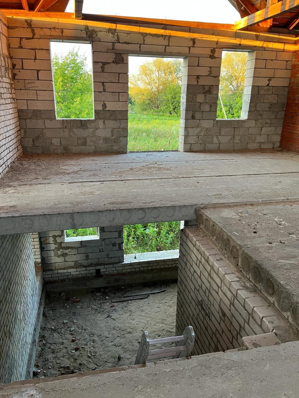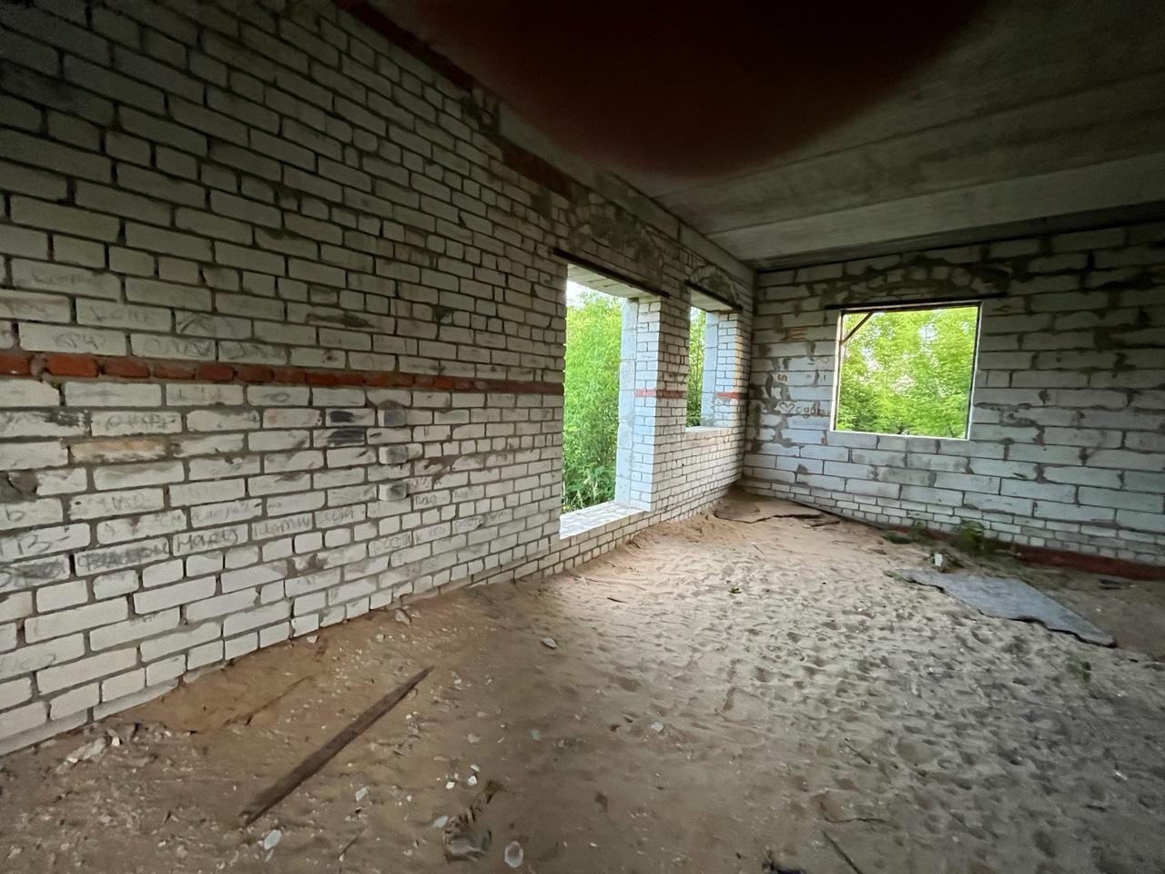 Дом из пенобетонных блоков и кирпича, под крышей (кровельное железо), перекрытия - железобетонные плиты. Газ на соседнем участке, свет у дома, канализация - местная (септик). Подъездные пути хорошие.