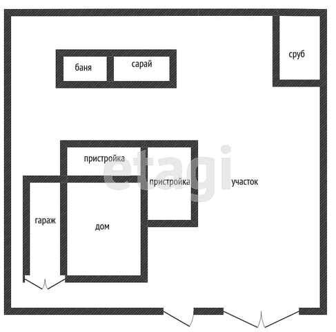 Земельный участок прямоугольный формы без уклонов. На участке гараж, баня, сарай, сруб все объекты не достроены.