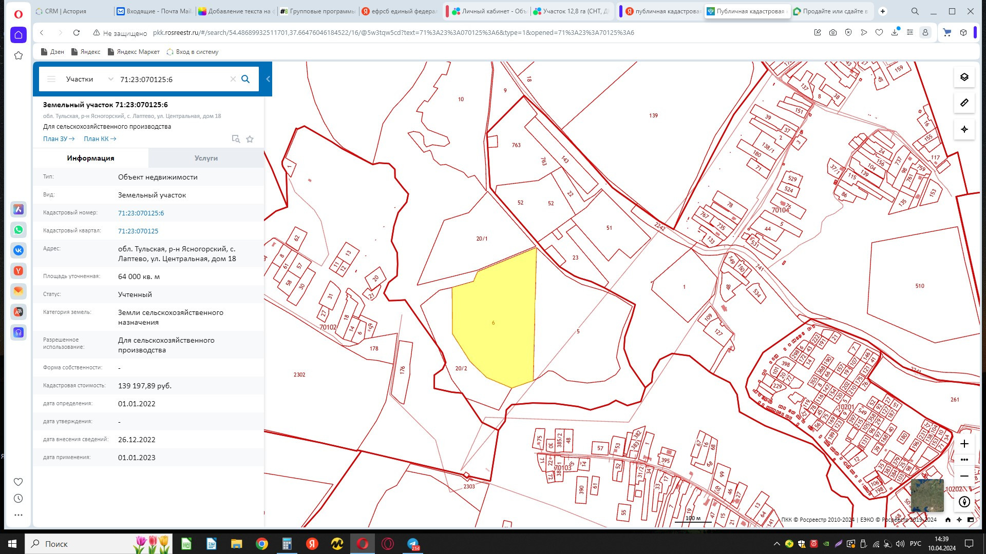 Продаю земельные участки сельскохозяйственного назначения 71:23:070125:6, 71:23:070125:20,71:23:070124:650  площадью 32 га в 0,5 км от районного центра - г. Ясногорск. В 200 м от асфальтированной дороги. В 12 км от М-2 (Москва - Крым) , в 30 км от М - 4. Рядом с участками 71:23:070125:6, 71:23:070125:20 расположены коммуникации. Обработаны согласно разрешенного назначения и использования (не залесенные). Рядом все коммуникации, удобная логистика. Законодательством предусмотрена возможность строительства жилого дома (площадь дома должна составлять 25% от площади участка).