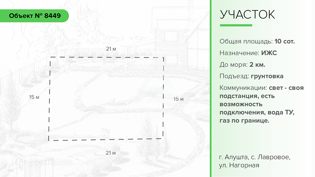 Продается участок в городе Алуште, село Лавровое. Общая площадь: 10 соток. Назначение: для индивидуального жилищного строительства.