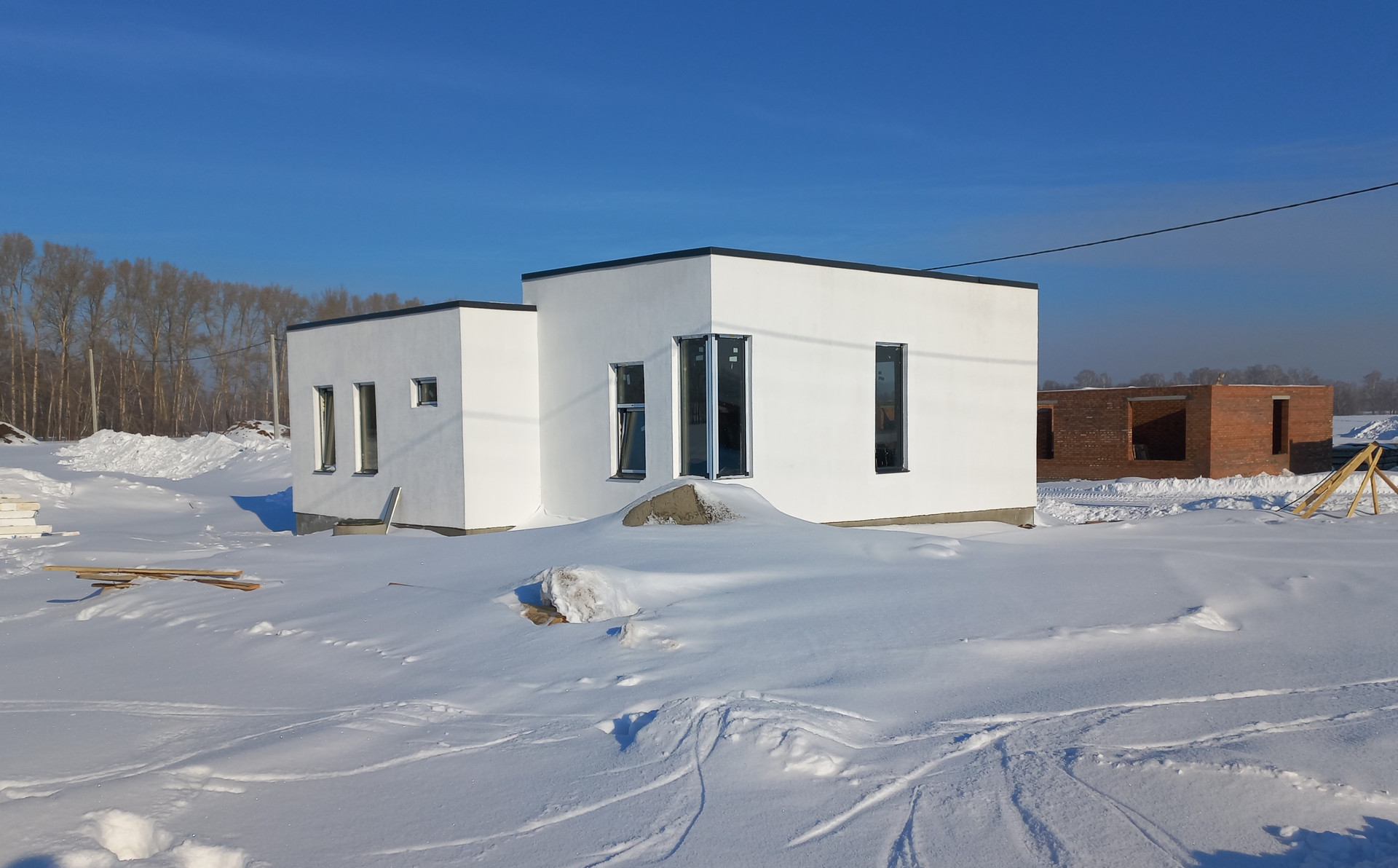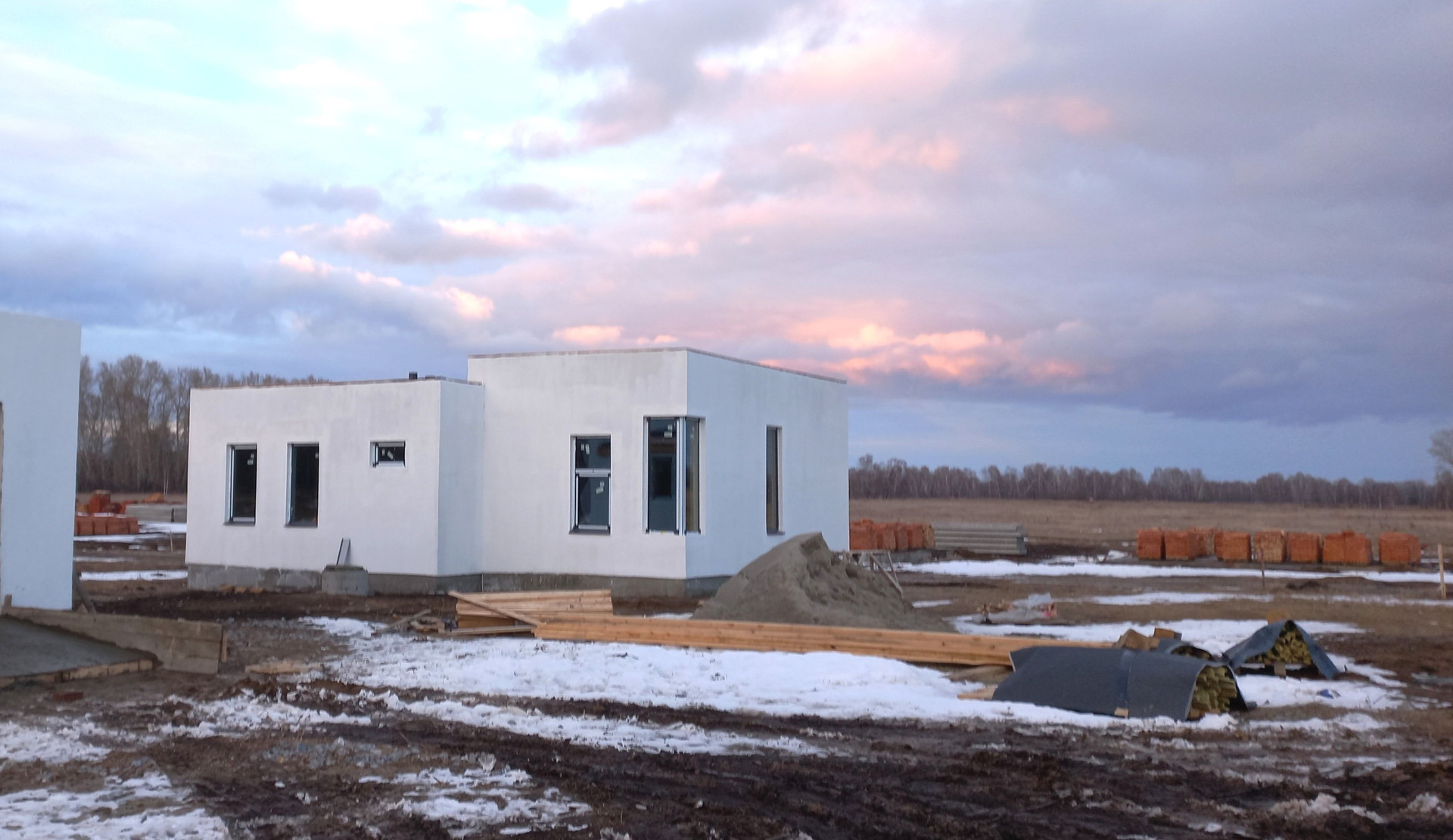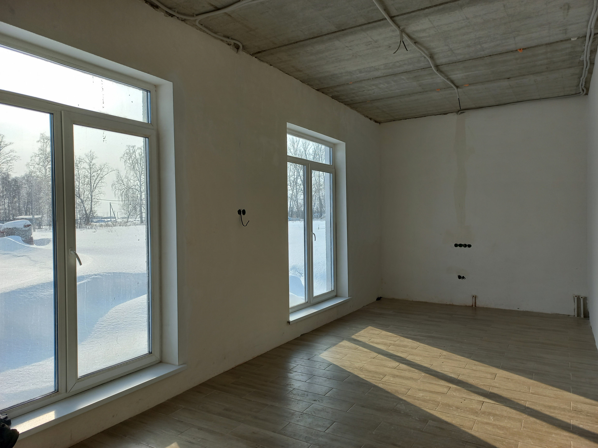 Предчистовая отделка (штукатурка стен, полусухая стяжка пола под чистовое покрытие, разводка электричества по дому, вода и канализация заведены в дом)