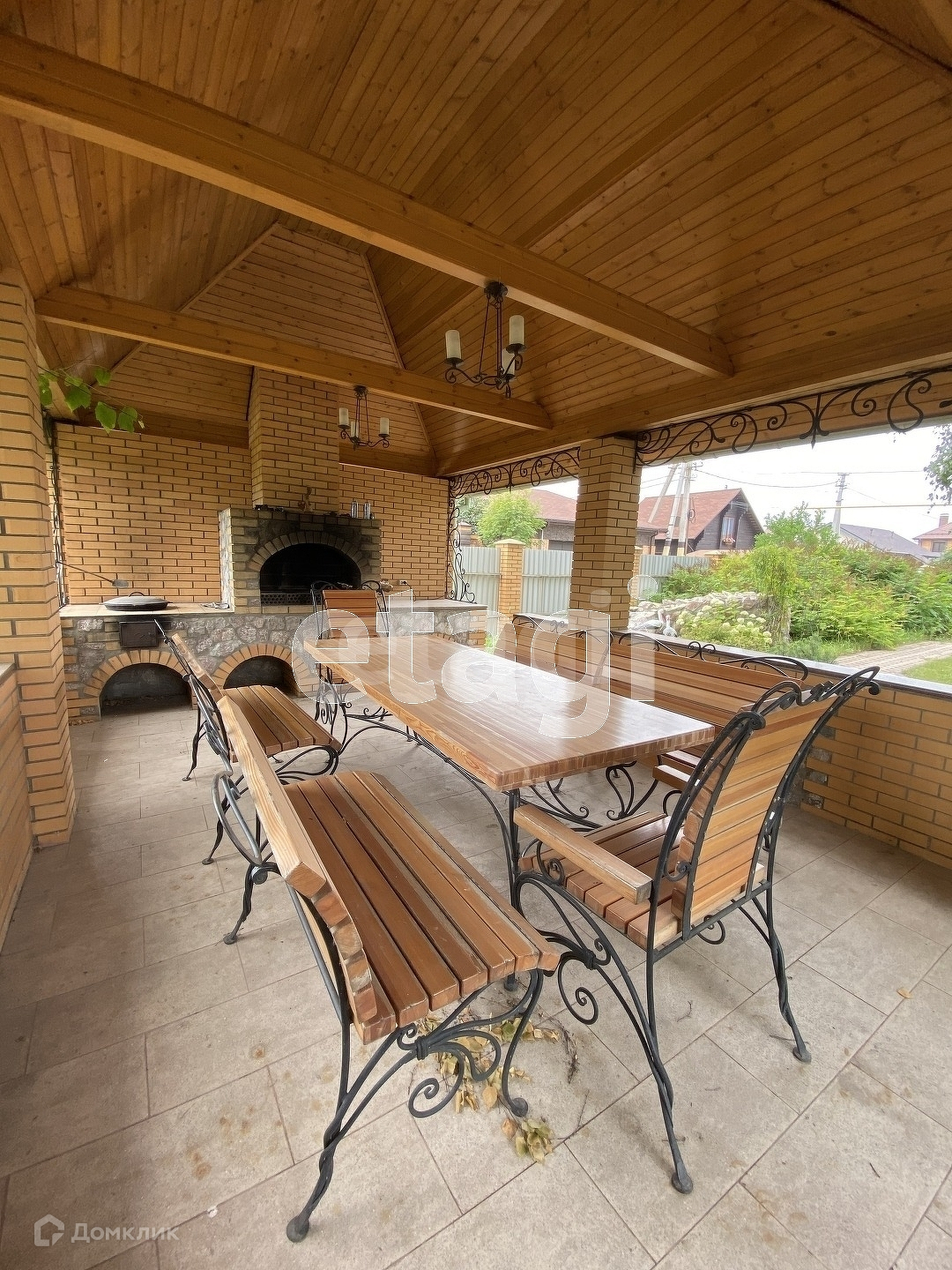 На территории много растительности, а также расположена баня, беседка с кованной мебелью, мангалом, казаном и фонтаном.