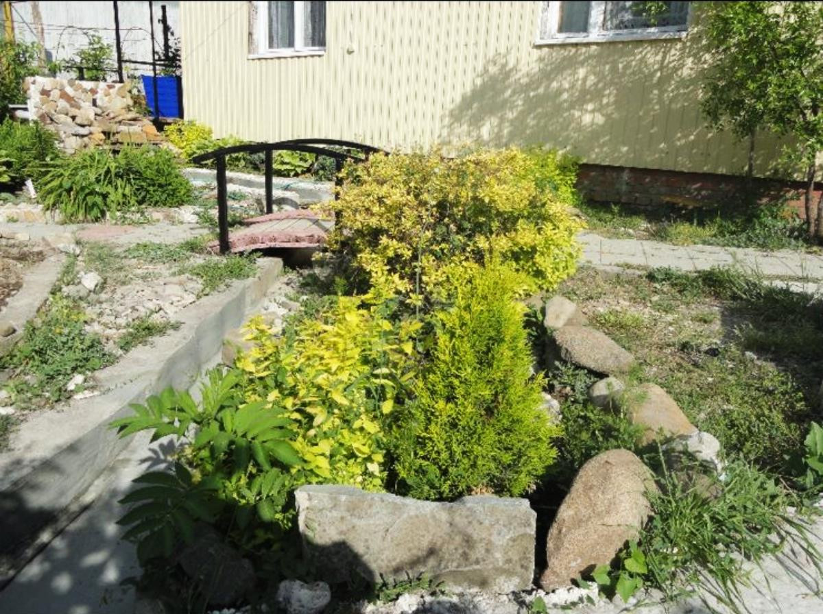 На 6 сотках земли - есть плодовые деревья: яблони, инжир, хурма, фундук, виноград, киви. Перед домом сделан ручей. Есть беседка, мангальная зона, красивые цветники.