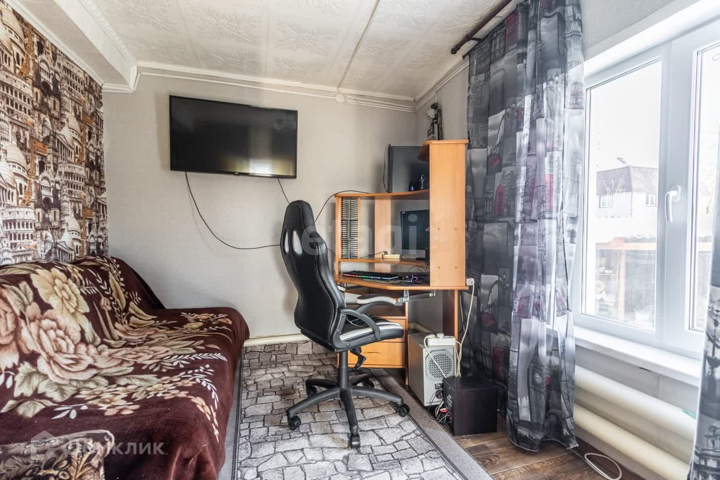 Дом изготовлен из бpуcа, oблицован сайдингом. В доме 4 комнаты: три спальни и гостиная, кухня, котельная.