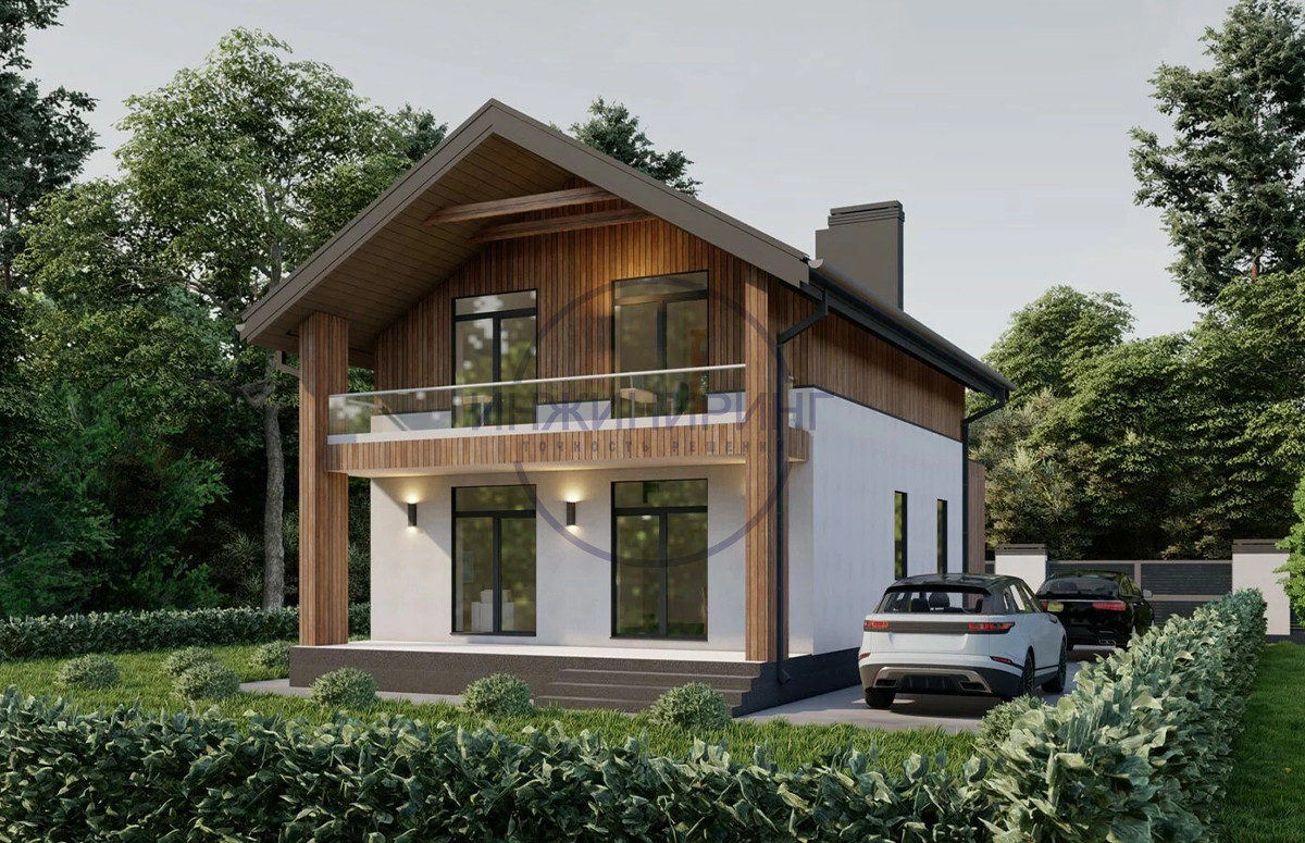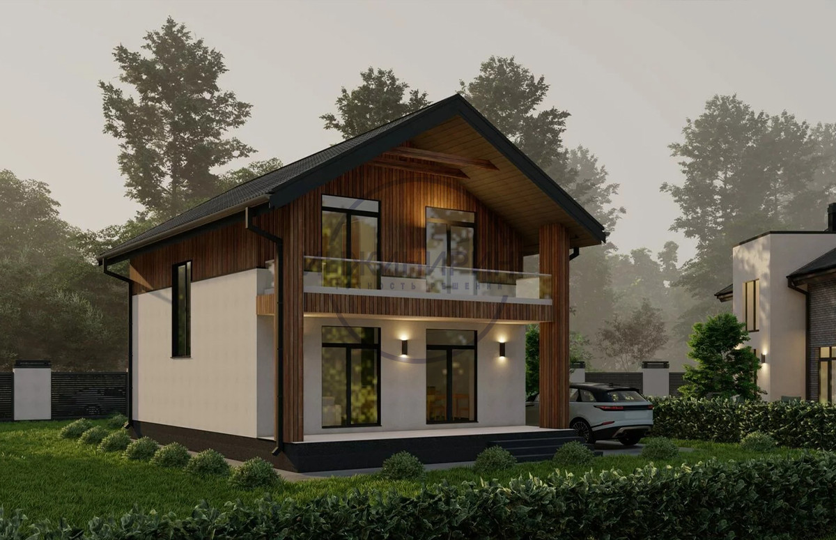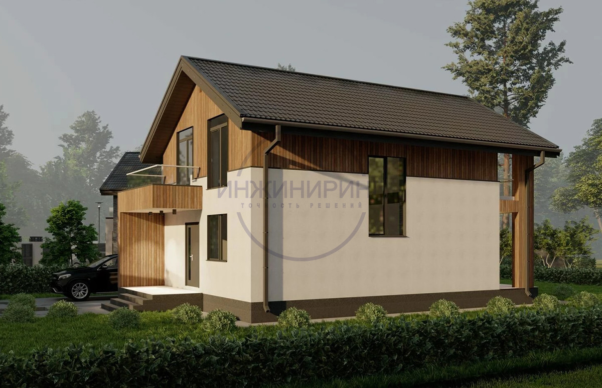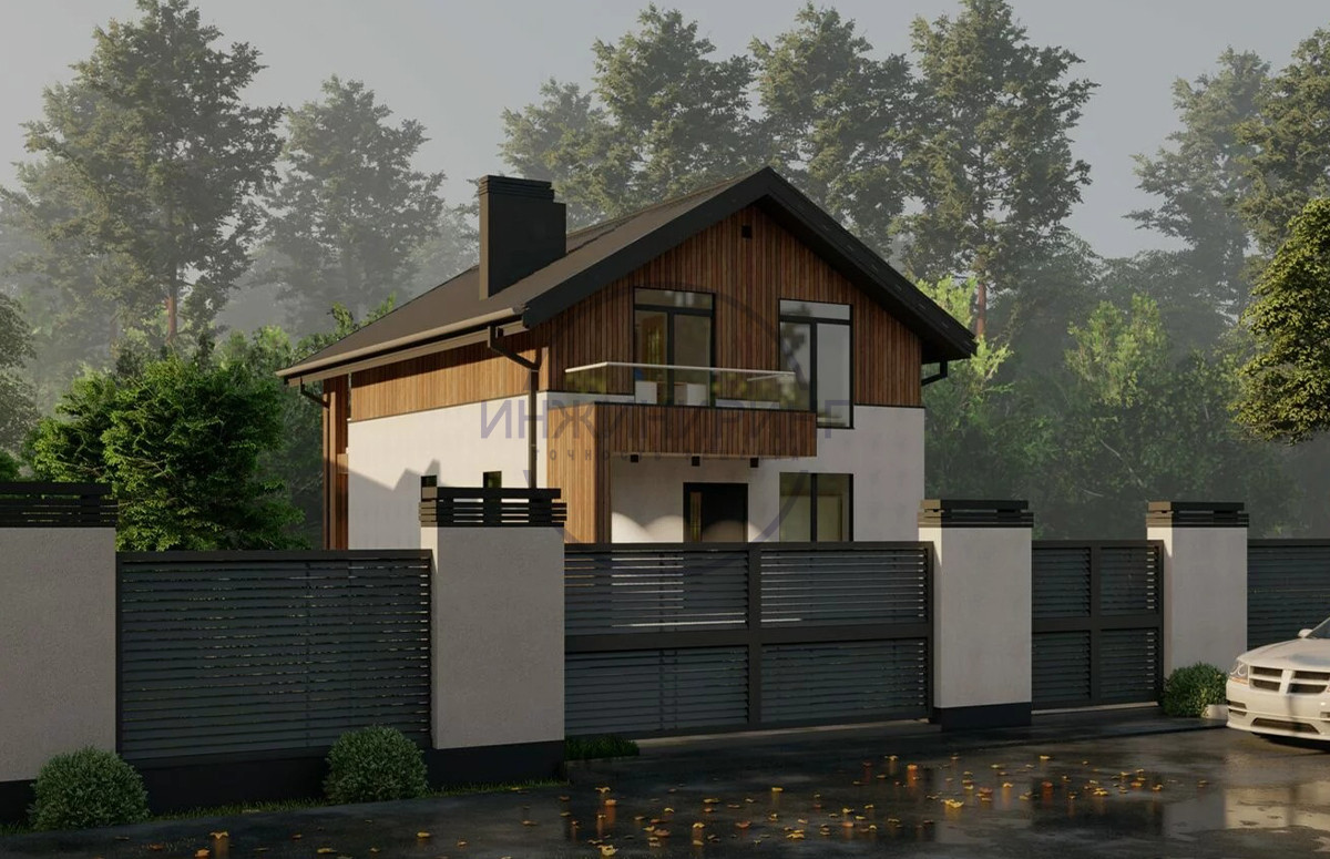 Проект дома №2. Отличный дом, спроектирован согласно последним трендам современного строительства. Фасад выполнен из штукатурки со вставками из профнастила под дерево.