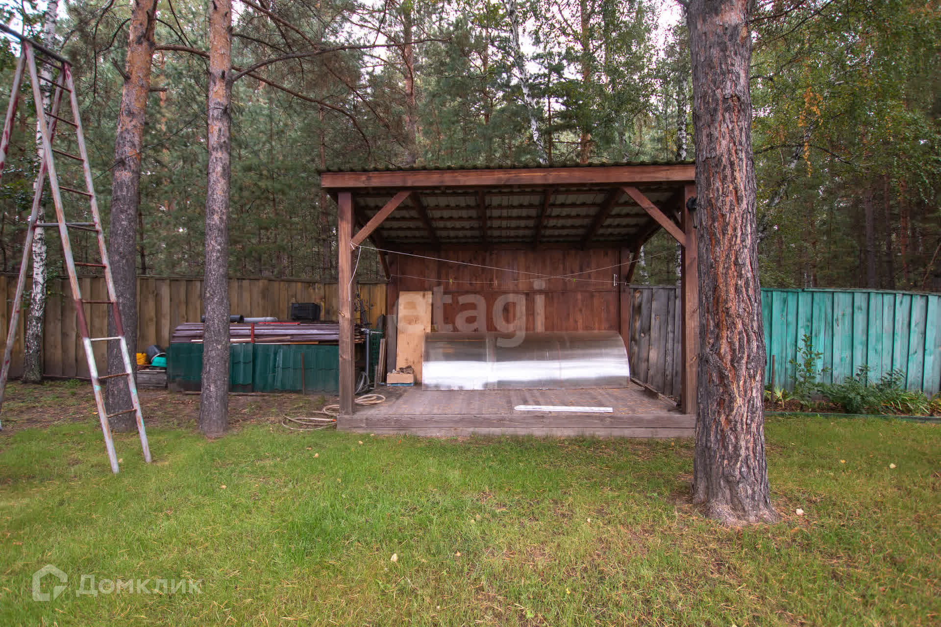 По соседству беседка с летней кухней, гараж. Территория, предназначенная для отдыха отгорожена от огорода живой изгородью.