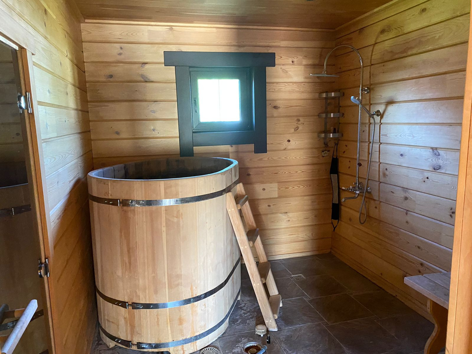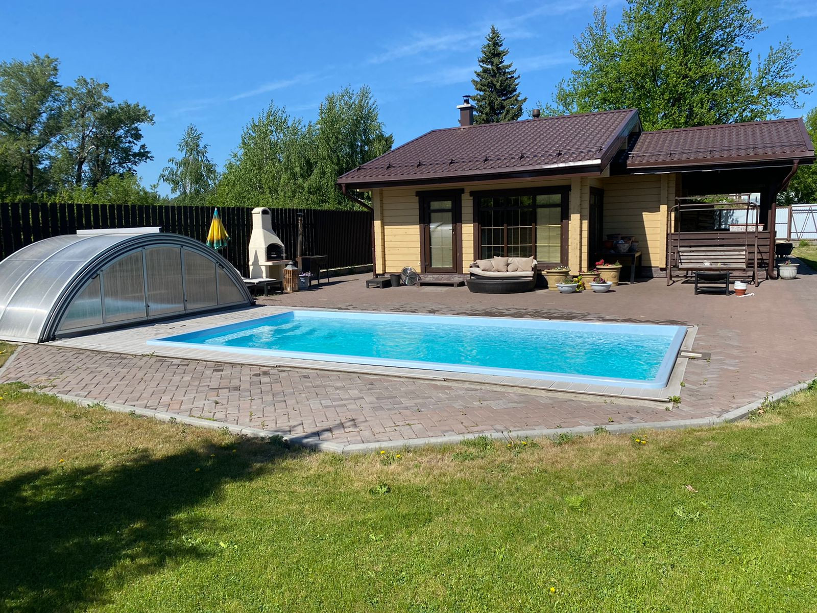 Баня( из клееного бруса) в комплексе с бассейном(закрывается, подогревается) и барбекю.