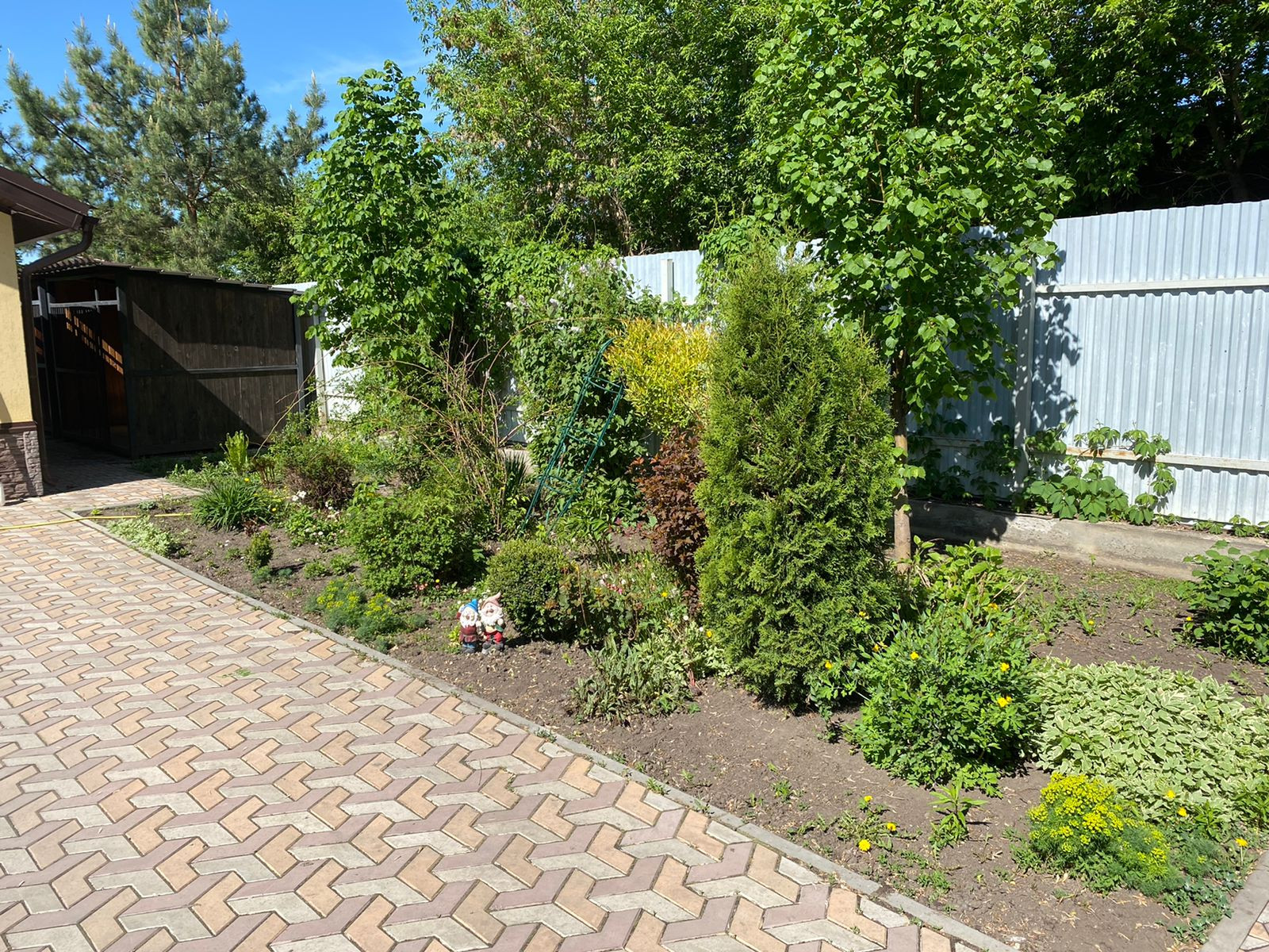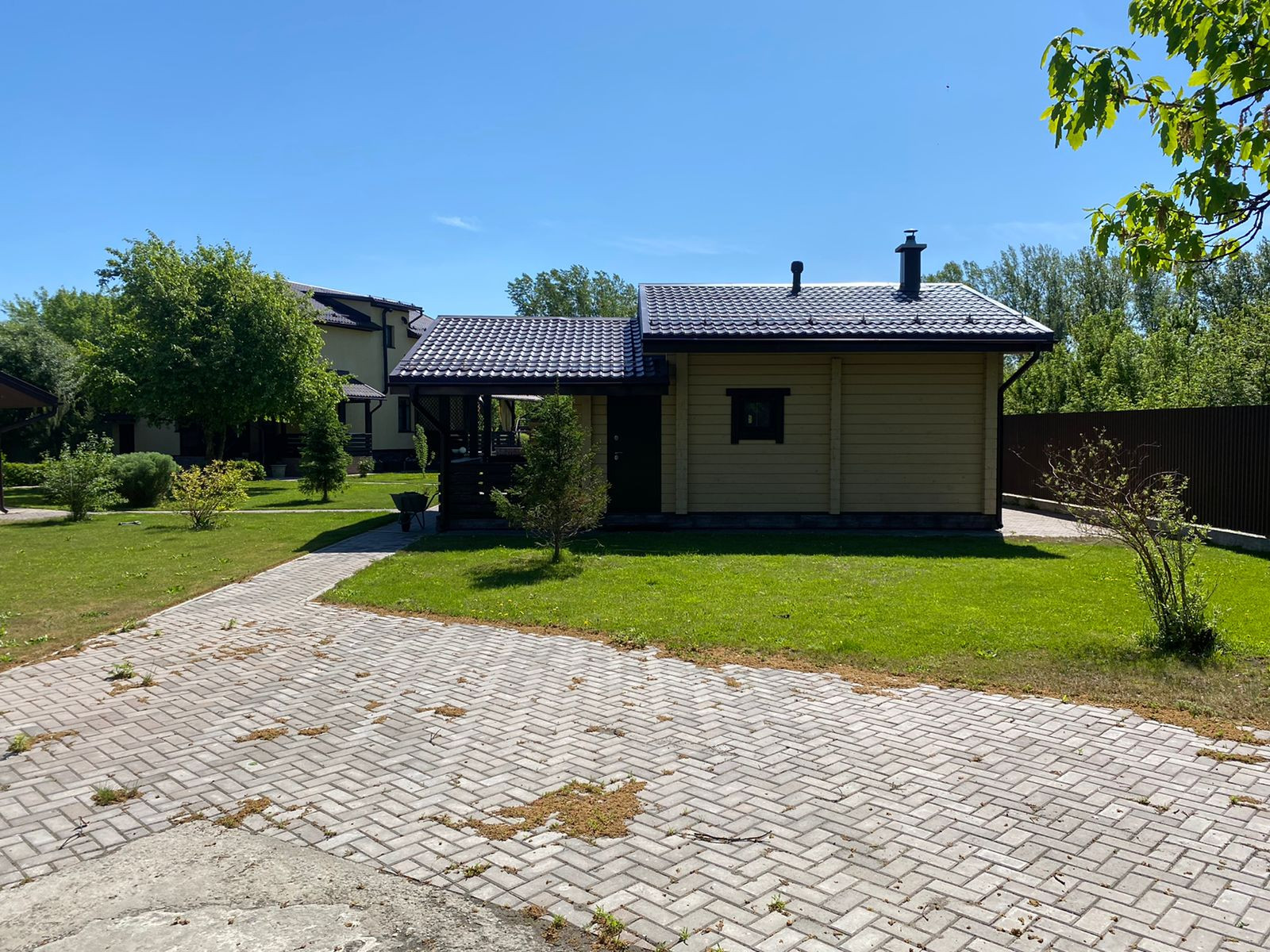 На участке сделан автоматический полив, посажен газон и декоративные растения.