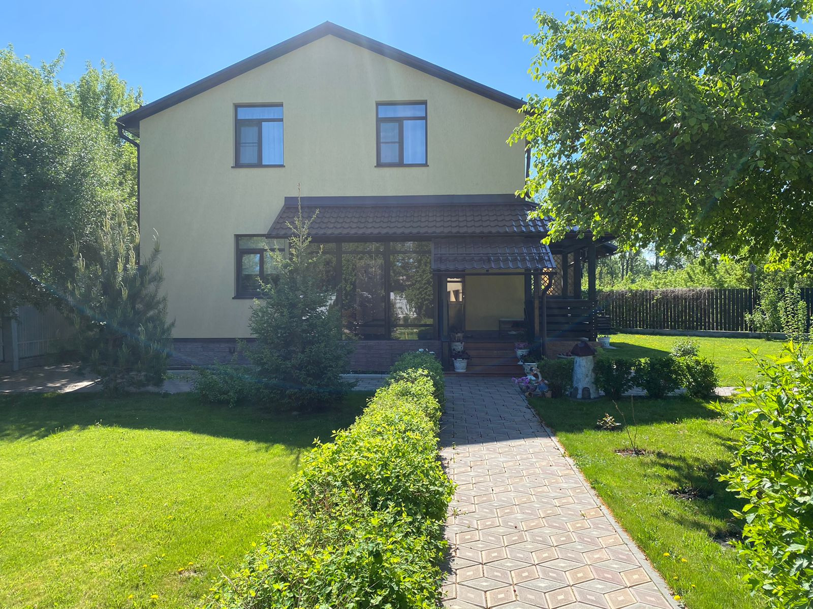 ДОМ в 2 этажа (есть подвал) сделан из пенобетона, покрыт дорогой фасадной штукатуркой.
