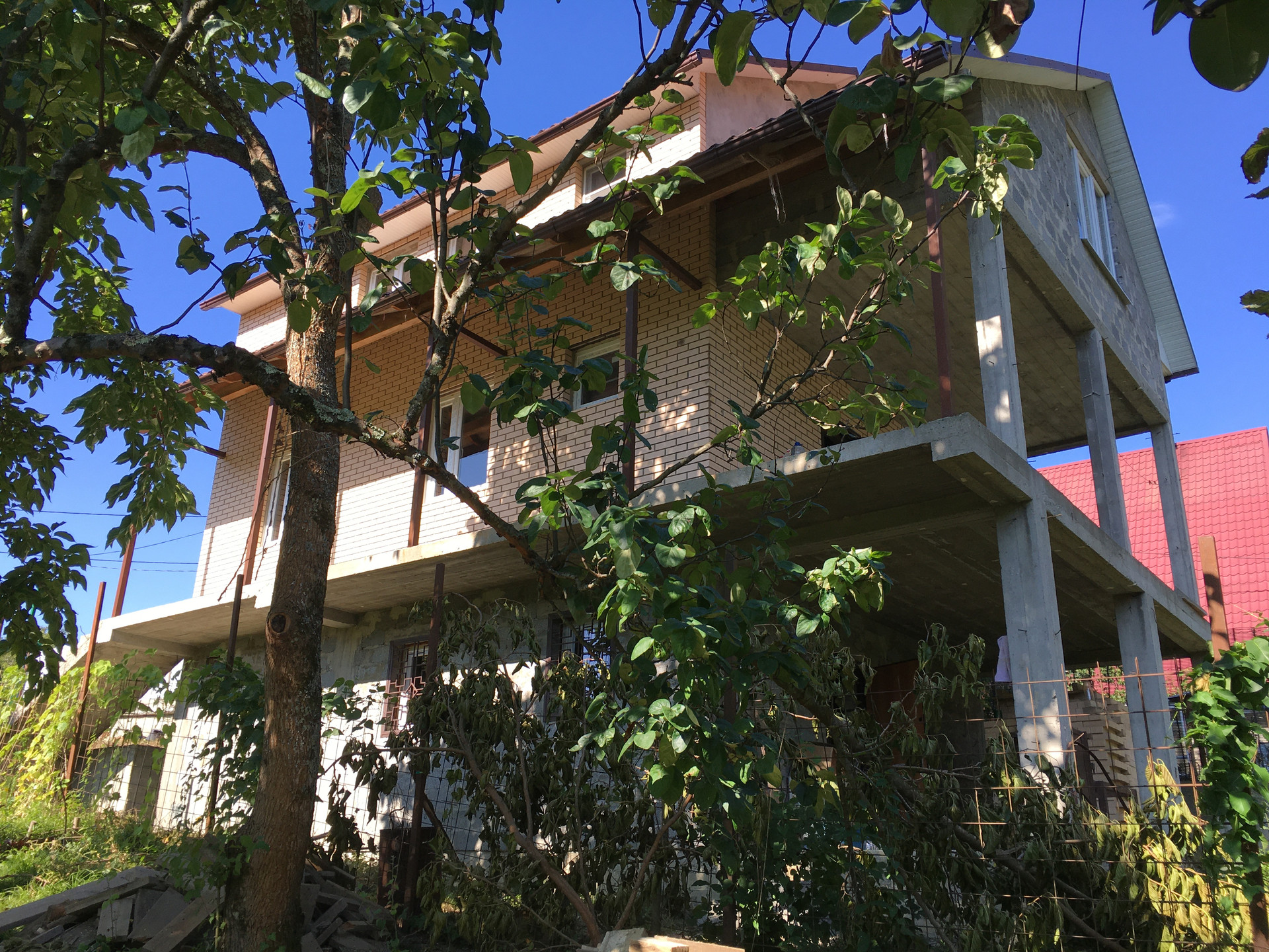 Дом 3 этажа (этажи изолированные, связаны лестничным холлом), две большие открытые террасы. Построен по сейсмоустойчивой технологии: монолитный армированный каркас, железобетонные перекрытия толщиной 25 см, стены 40 см - блоки, обложенные кирпичом. В доме установлены пластиковые стеклопакеты, сделано отопление, опресовано - стоит твердотопливный котёл Roca. На каждом этаже предусмотрен санузел, сделано водоотведение.