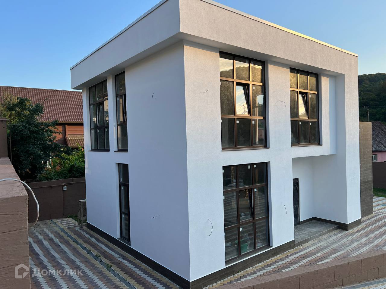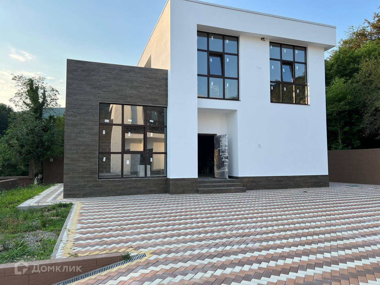 Фасад отделан керамогранитом и белой декоративной штукатуркой.