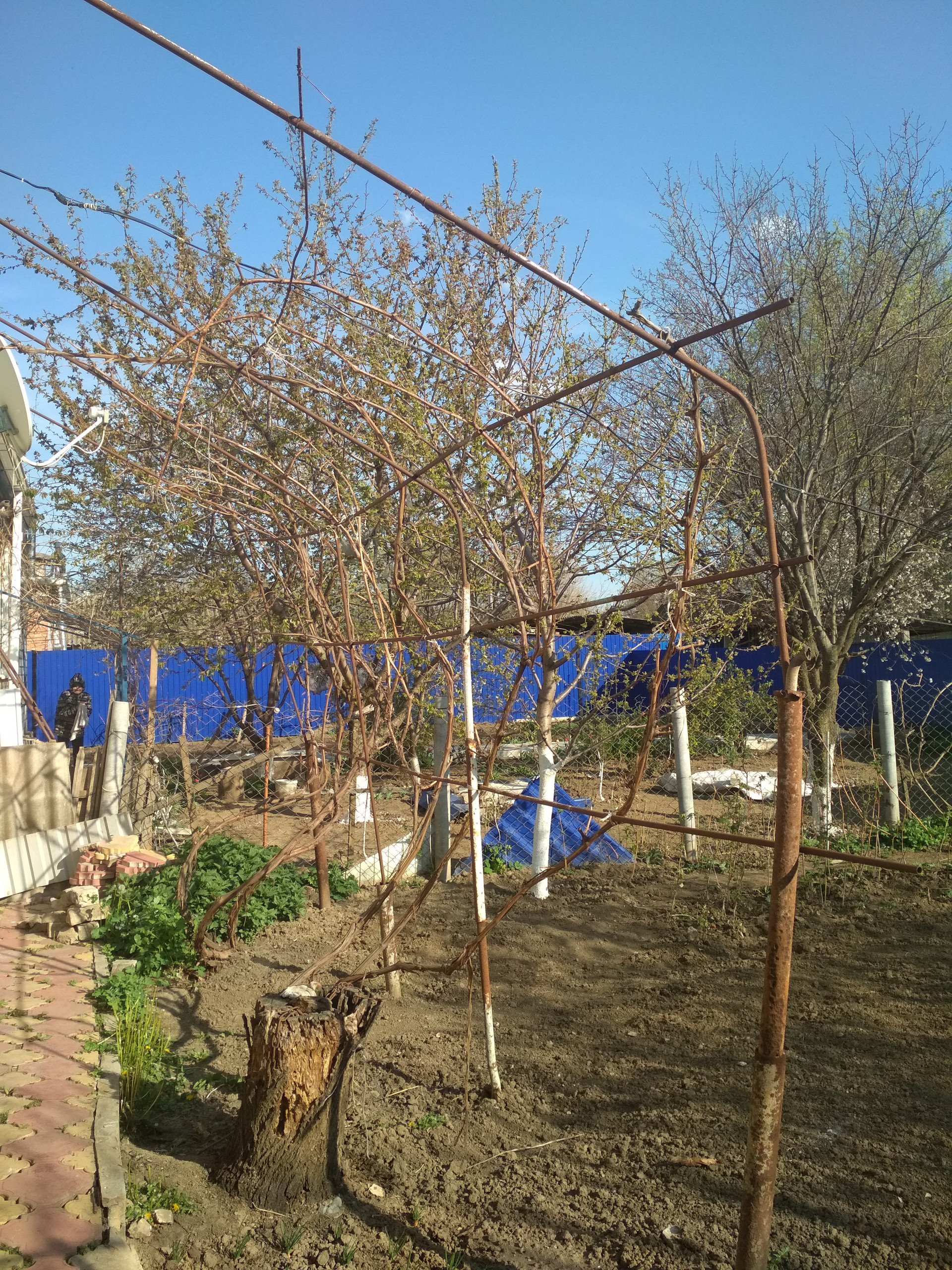 Во дворе посажены молодые фруктовые деревья, виноград, клубника, малина, цветы.