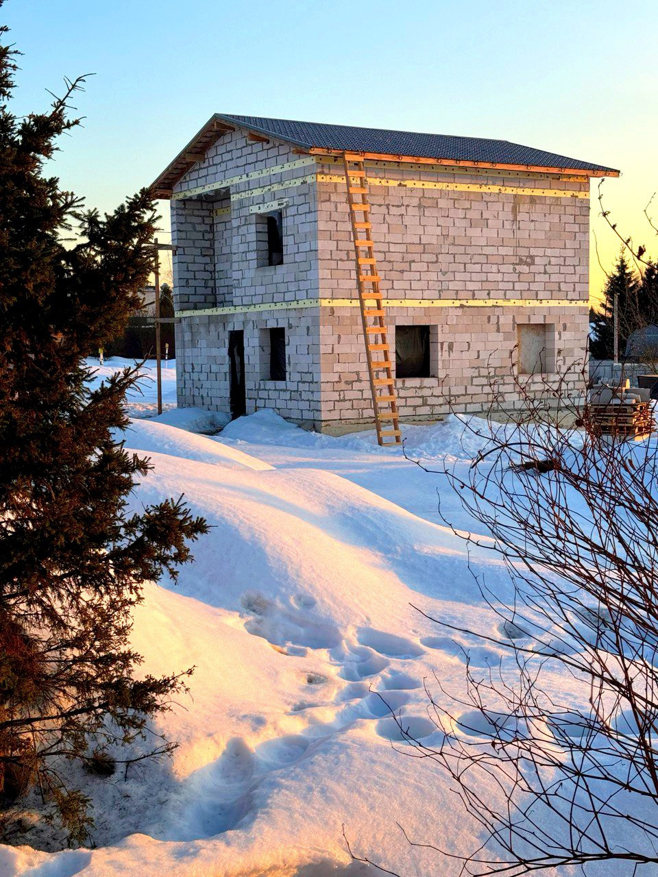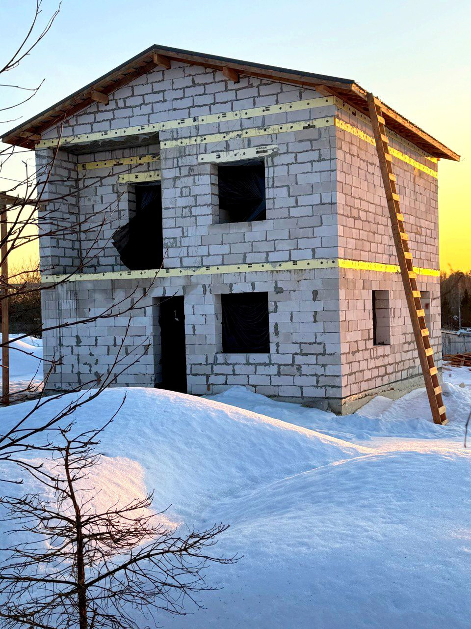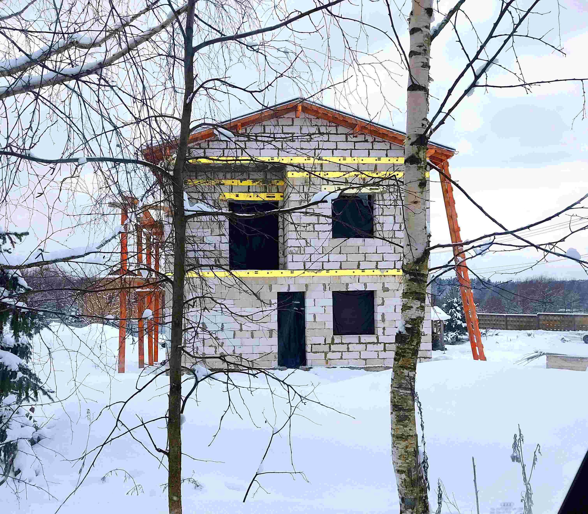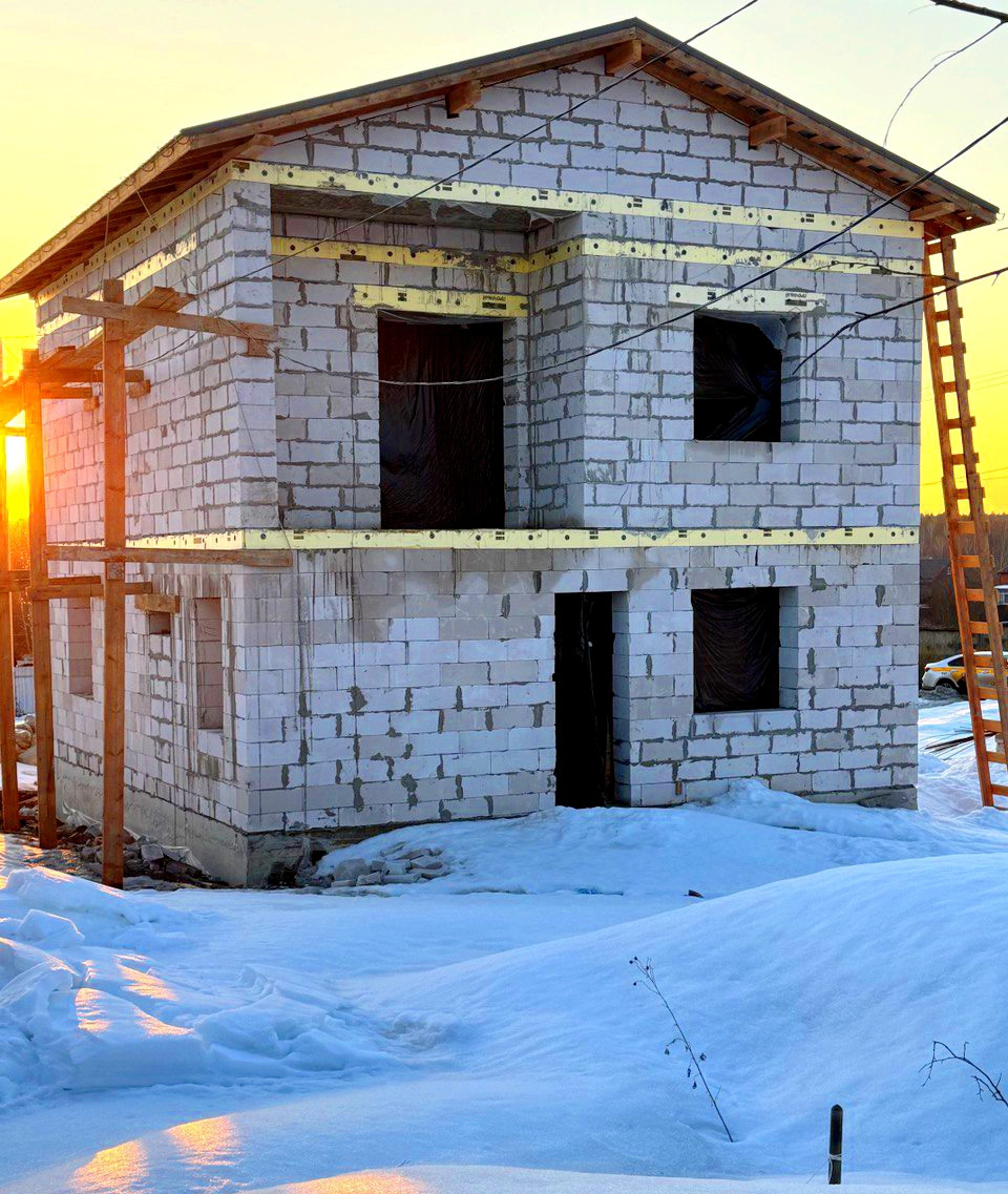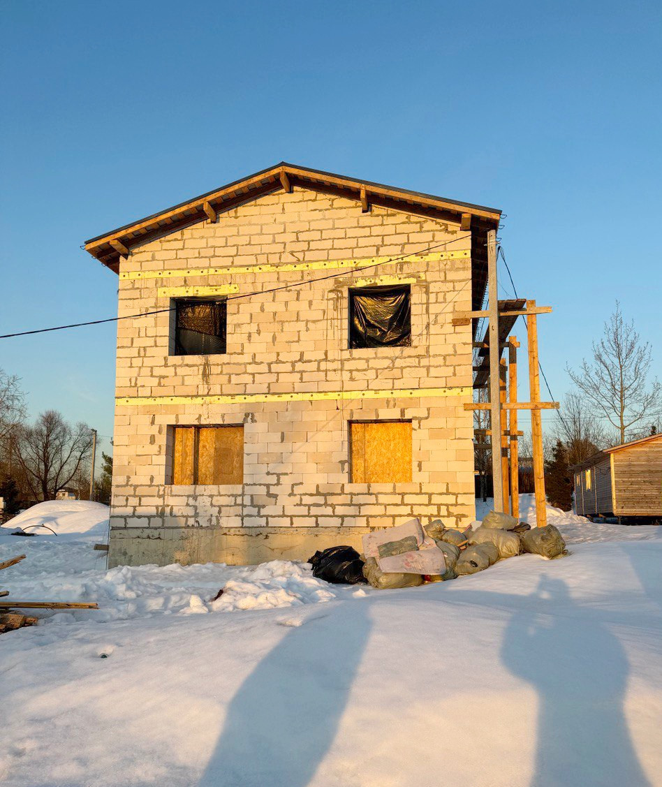 Дом из газоблока 400мм. Окна профиль 70 мм. ( будут в первых числах апреля, цвет: темный шоколад). Фундамент: Лента + плита. Ж/Б перекрытия. Крыша с чердаком. Утепление крыши 200 мм. Полноценный 2-ой этаж с высотой потолков 3 м.