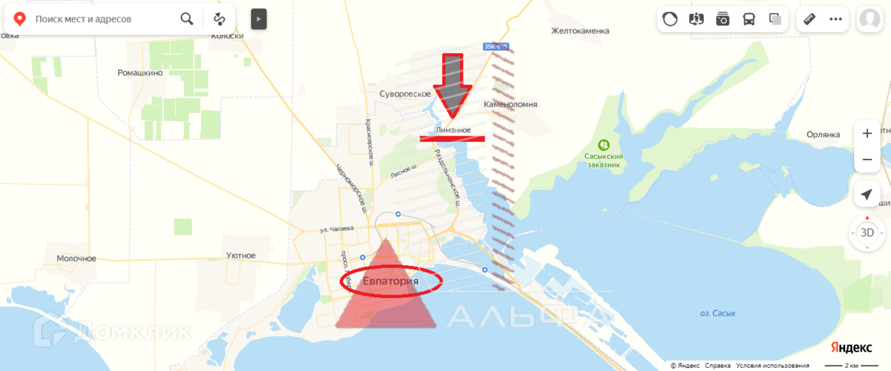 Расстояние до города Евпатория 6 км, до ближайшего песчаного пляжа 7 км, до озера Сасык Сиваш 300 метров.