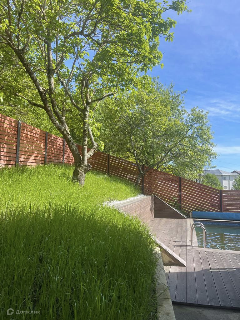 На территории сделано ландшафтное озеленение и есть сад с фруктовыми деревьями, зона отдыха и загара с бассейном.