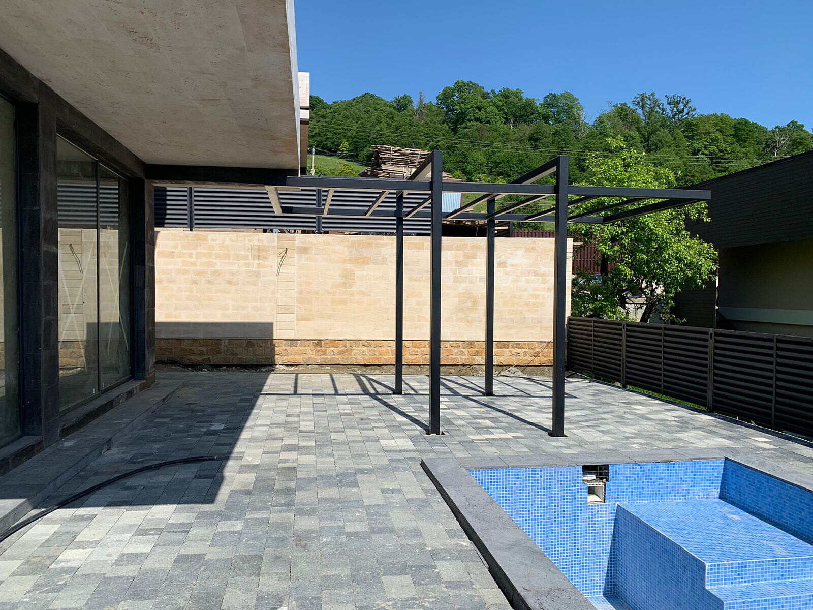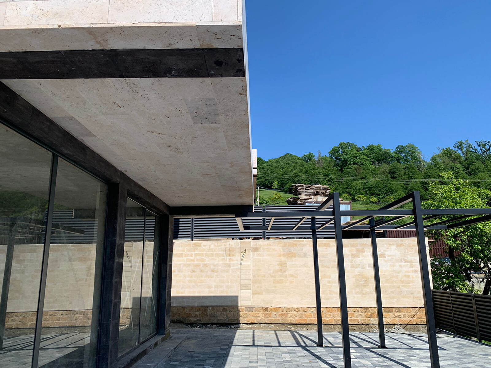 Основной облицовочный материал стен: Натуральный Травертин (светлый, калиброванный, Республика Армения), дополнительный: Натуральный Туф (Республика Армения). Стеновые блоки: керамзитовые (собственное производство). Тротуарная плитка: ColorMix «Резиденция» (собственное производство).