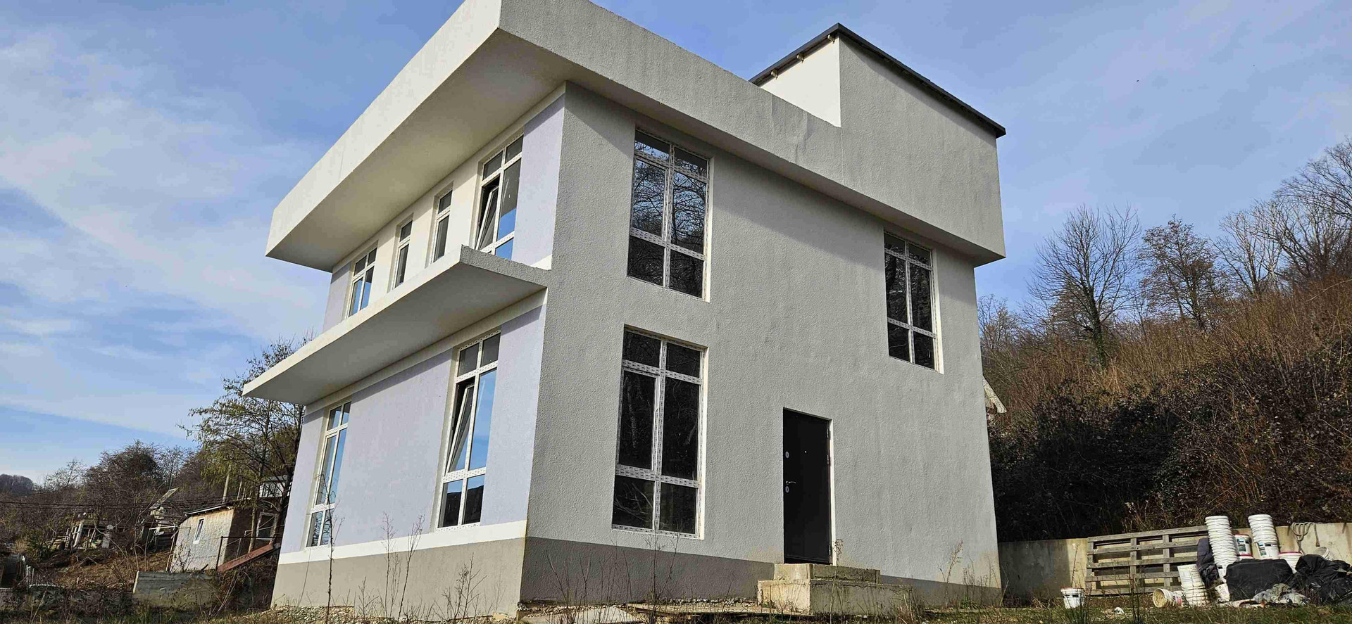 Нa 1 этaжe бoльшая куxня-гостинaя и cанузел. На втором этаже три комнаты (из двух выход на балкон) и санузел. На задней стороне дома есть небольшая кладовая с отдельной дверью. Внешняя отделка в процессе завершения. Документы в порядке, ипотека.