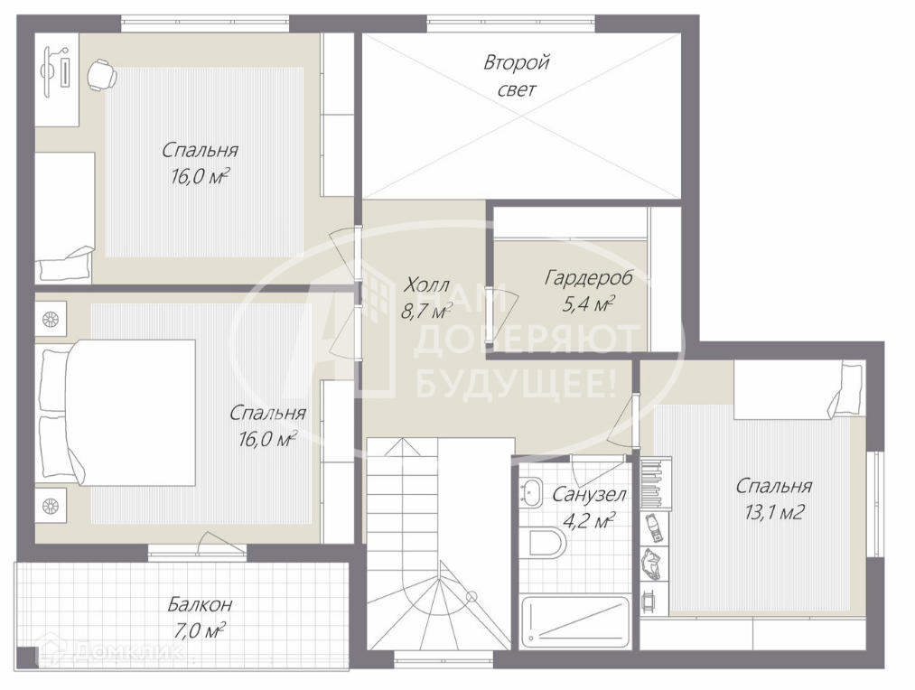 На втором этаже - три спальни, одна из них с балконом. Хозяйский санузел с ванной, общий для всех гардероб для хранения постельного белья, сезонных вещей.