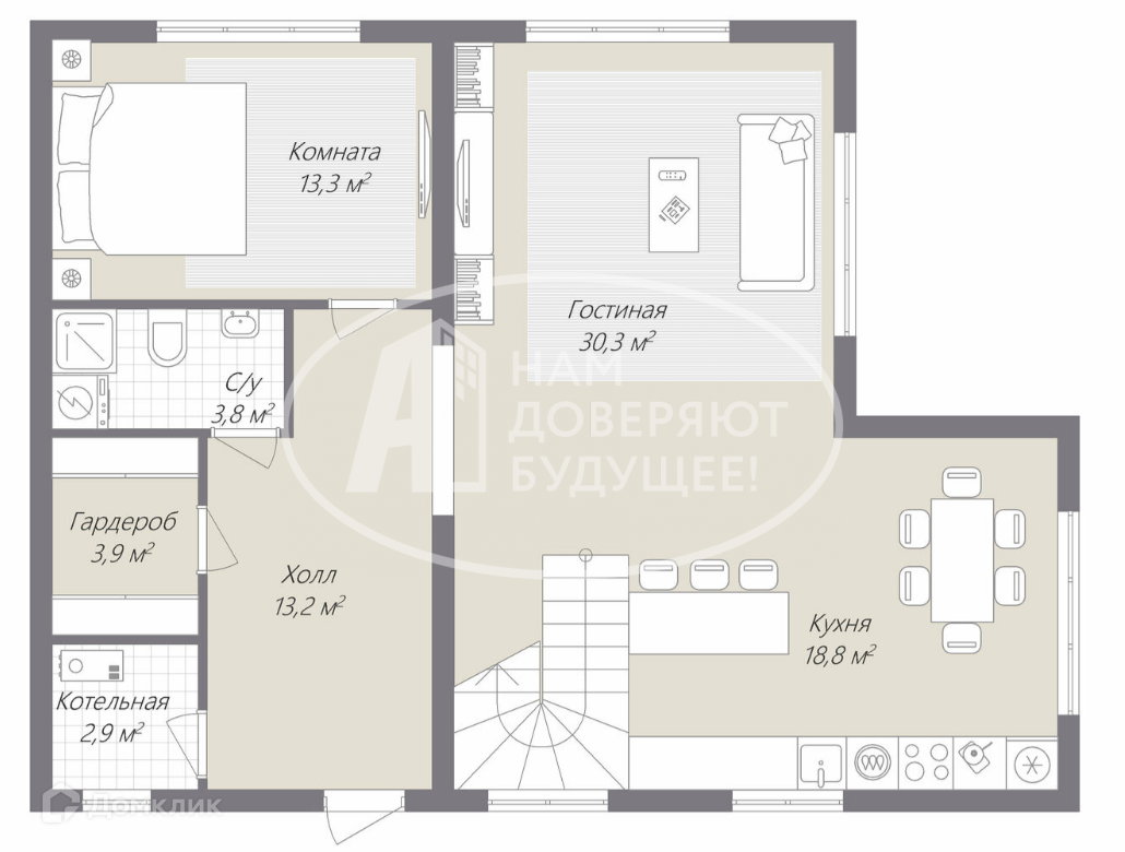 Кухня-гостиная общей площадью более 50 кв.м. Второй свет над гостиной. Интерьерная лестница.