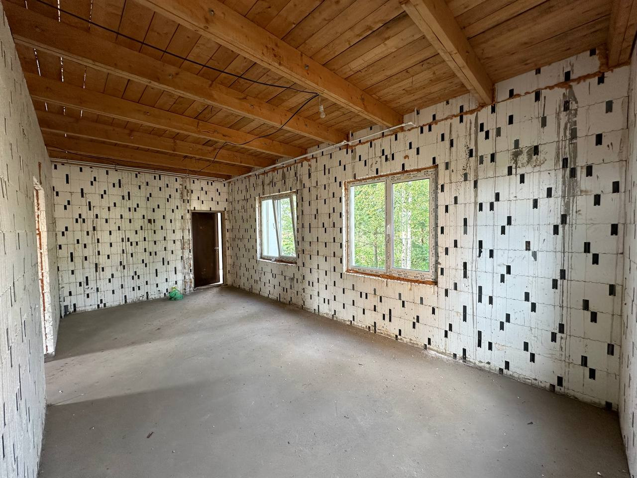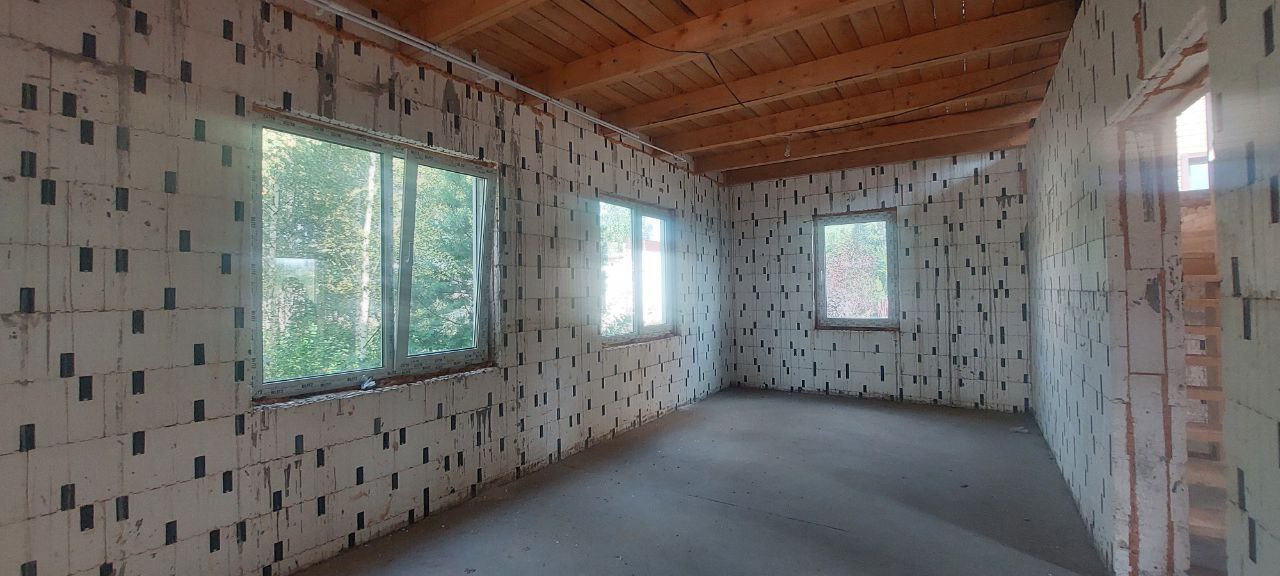 Дом в настоящее время находится на стадии строительства. Возведены стены, есть крыша.