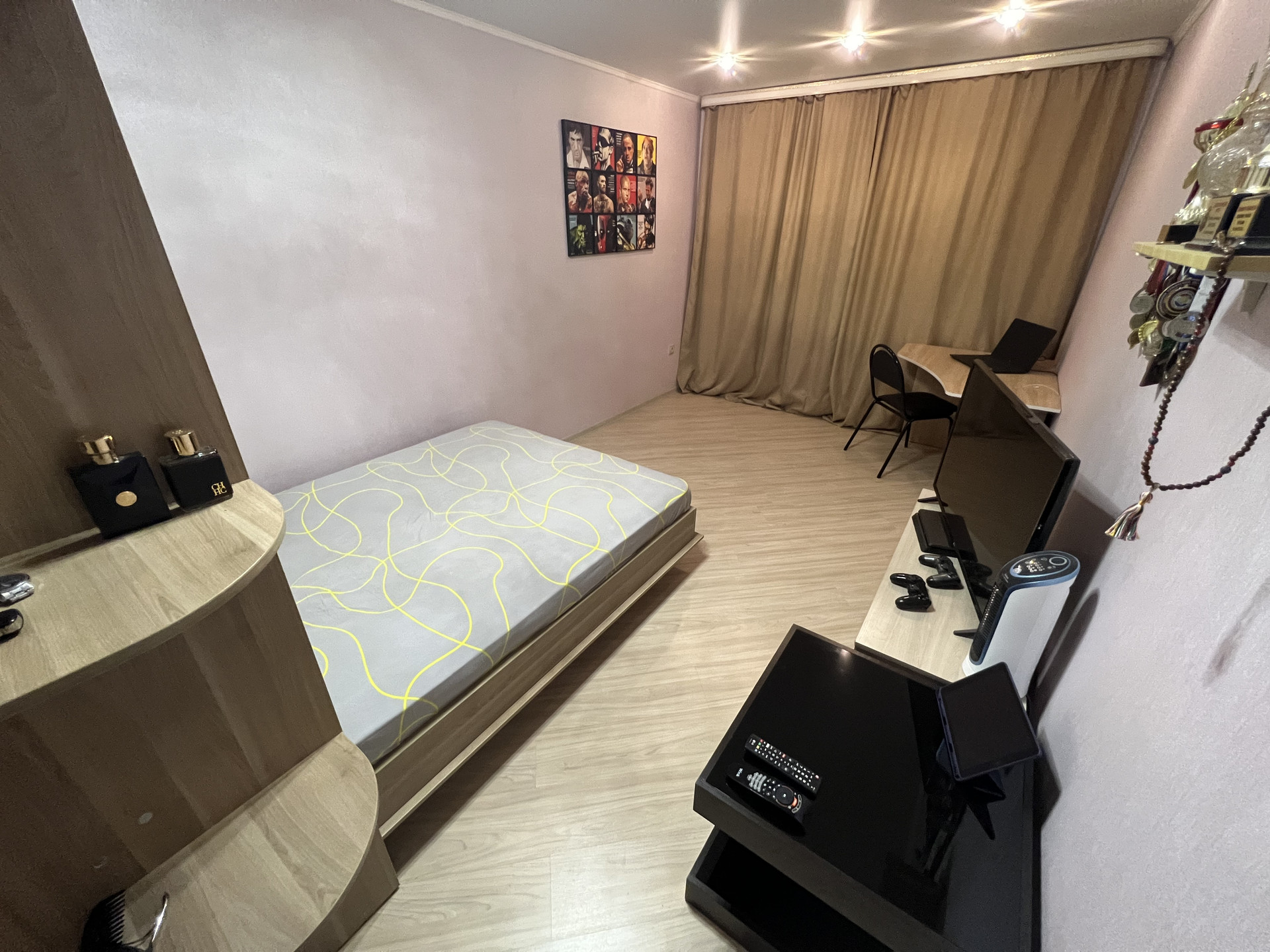 Квартира находиться на 2 этаже 5-и этажного дома. Выполнен качественный ремонт. Состояние заезжай и живи. Комната покрыта ламинатом. Прихожая , туалет и гардеробная плиткой. Теплый пол. Остаётся встроенный кухонный гарнитур, холодильник, кровать. Балкон застеклен и утеплен.