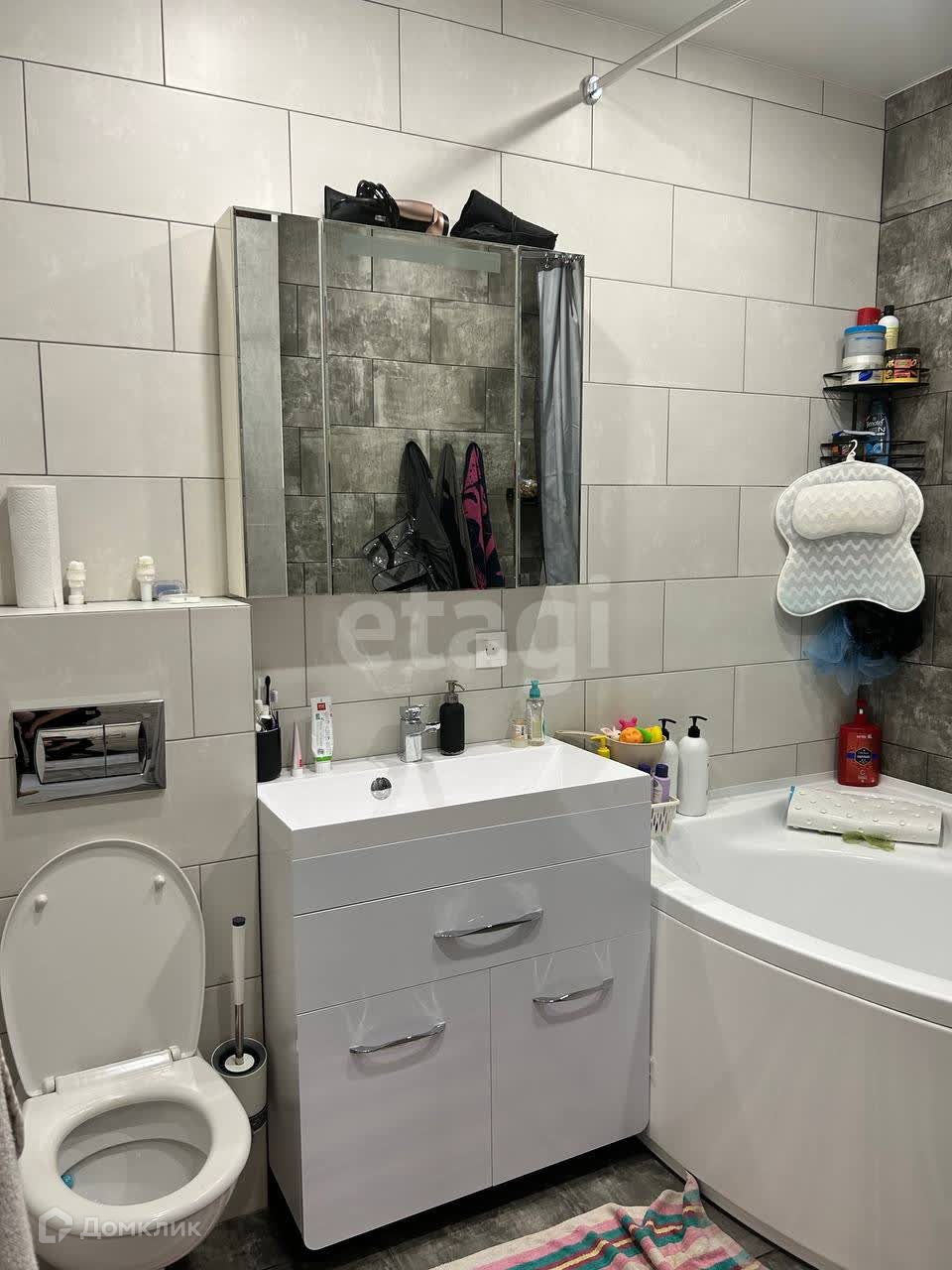 В совместном санузле размещается просторная ванна,тумба с раковиной, шкаф с зеркалом и подвесная инсталляция.. Номер в базе: 10084006. Район: Южный город